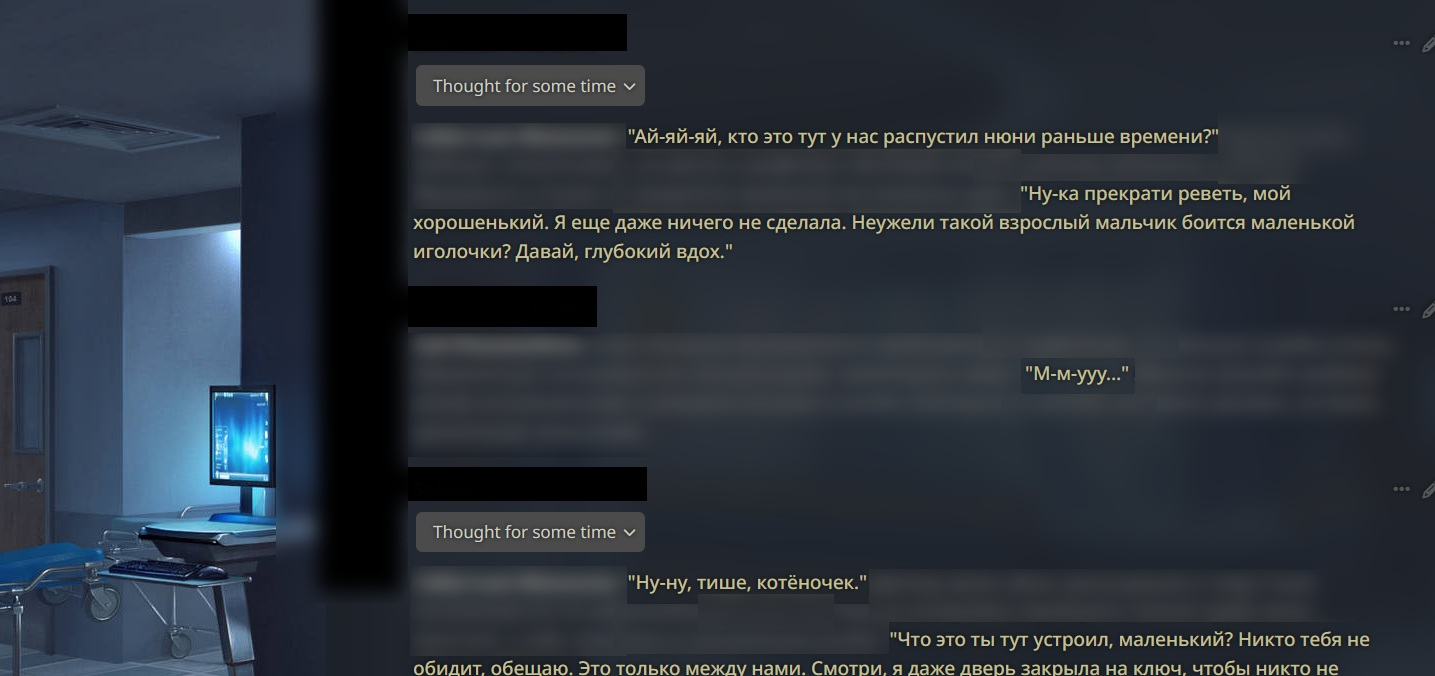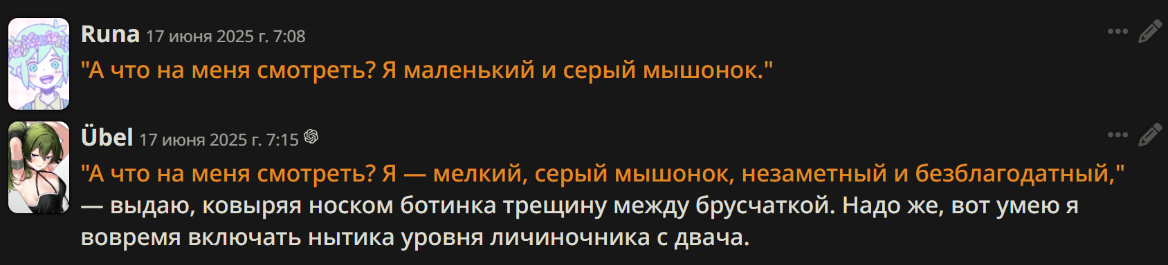 >>1248079 Ахуенные логи, я до сих пор не мойму что с ними не так? Лупы можно затерпеть, когда там настолько качественная проза и диалог как живой. У членини подобного даже за 1000 свайпов не будет, а тут буквально каждый свайп это зирошот