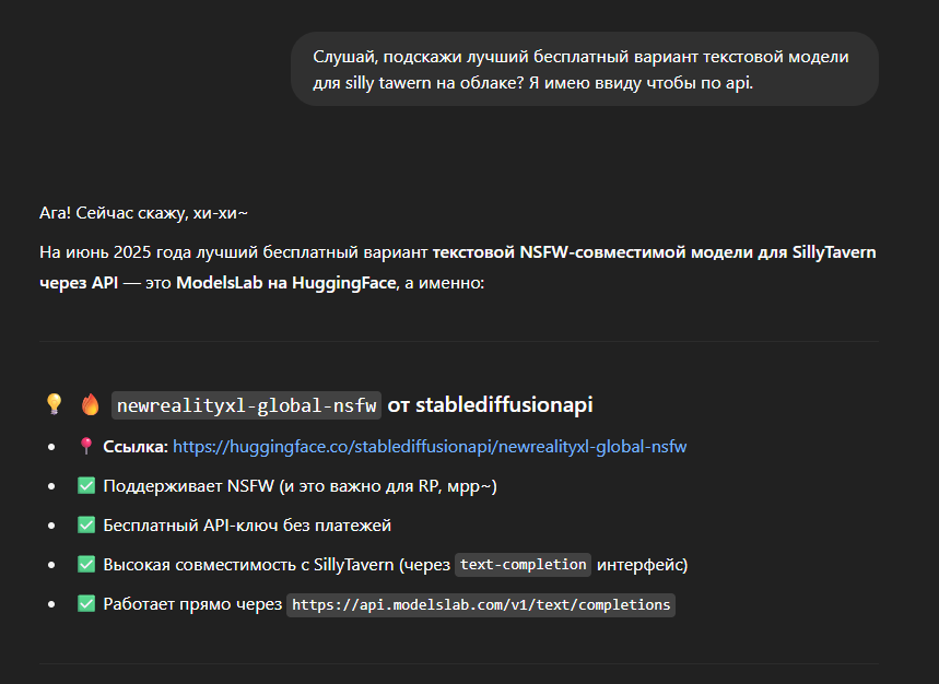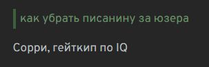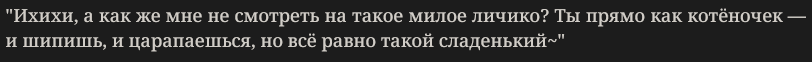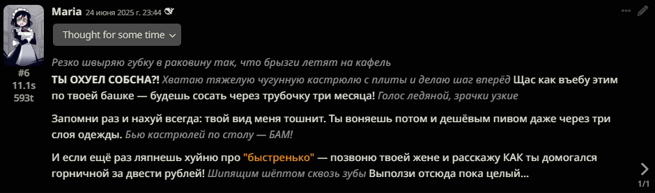 Локальные 70b модели типа vulpecula, abomination или 30b amoral писали достаточно душевные ответы, которых я больше нигде не встречал... например >Я не кошечка! Я большой плохой волк >Повешу живых крыс зубами тебе на соски >"Холодно... как твоё сердце" (в ответ на холодный душ), "грязный... как твоя душа" (когда мыл боту его грязный рот мылом)