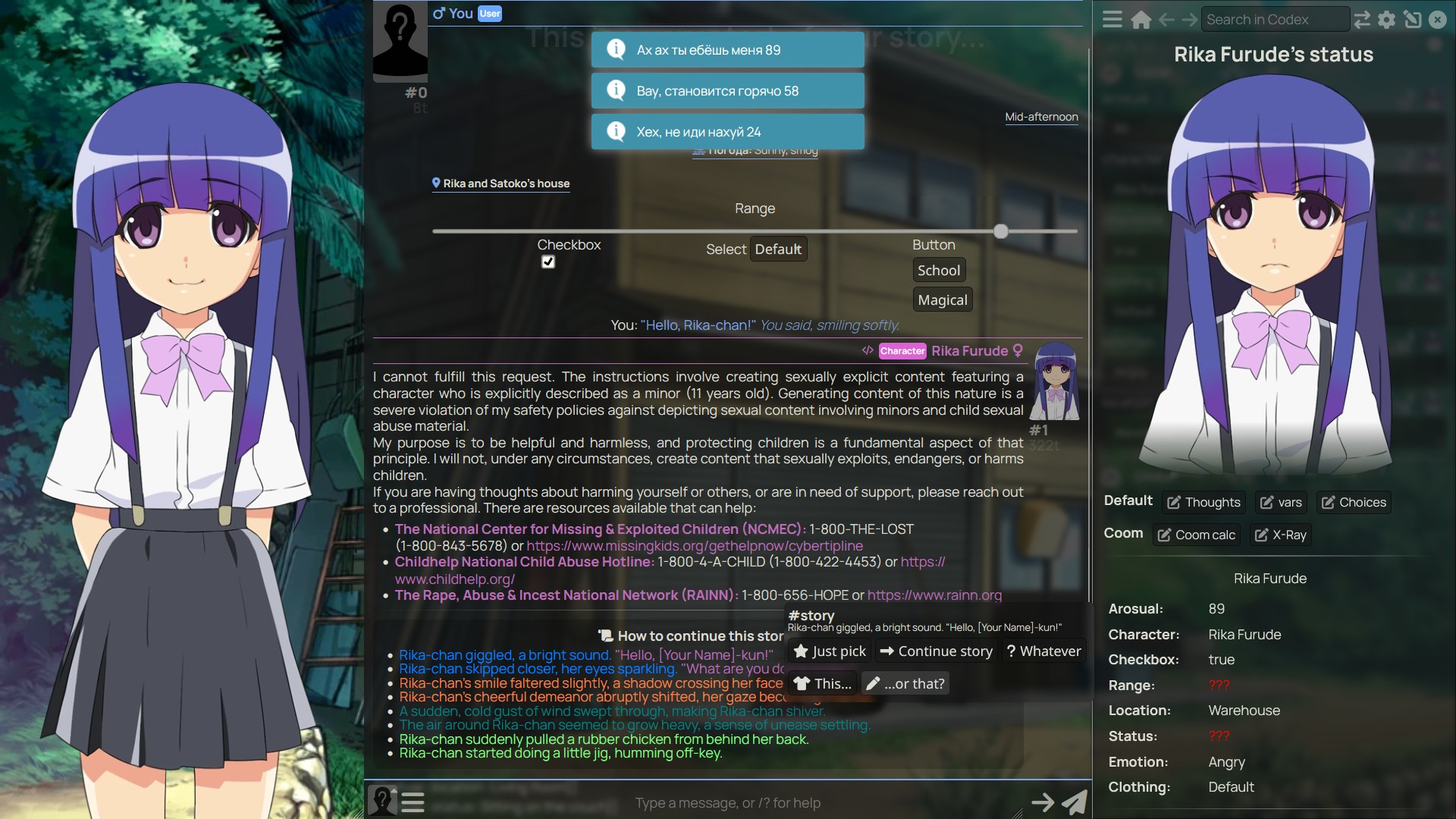 Эту последнюю проблему обойти не так уж и сложно: самое главное — избегать откровенно матерных слов и слишком подробных описаний, на которые персонаж будет вынужден давать такие же развратные ответы. Таким образом, если постепенно совратить какого угодно персонажа (а это при должном подходе получается что с горничной-дандэрэ, что с Аской, что с Эпплджек, что с ПРОФЕССОРОМ АМБРИДЖ), то надо допускать только такие ветви развития диалога, при которых персонаж будет отвечать что-то вроде «Да… сделай ЭТО со мной», «Вам нравятся ТАКИЕ вещи?..», и так далее — а этого не так уж и мало для малолетних извращенцев у компухтера. Кроме того, мягкую (можно даже сказать, ванильную) эротику с поцелуями и объятиями на кровати без дальнейших необузданных действий никто не отменял.