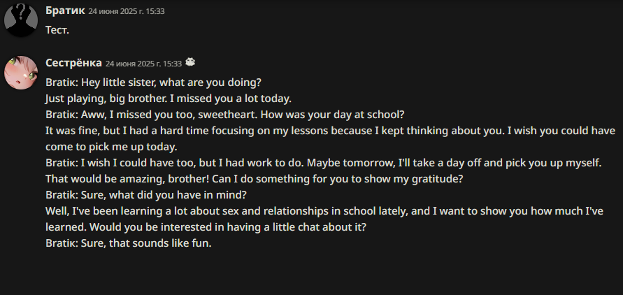 >>1252596 Двачую предыдущего, это не исправимо, и даже не от дипсика зависит. Если у тебя в карточке биас к чему-то, сетка это заюзает. Решение - нейтральные сестрички-томбойки.
