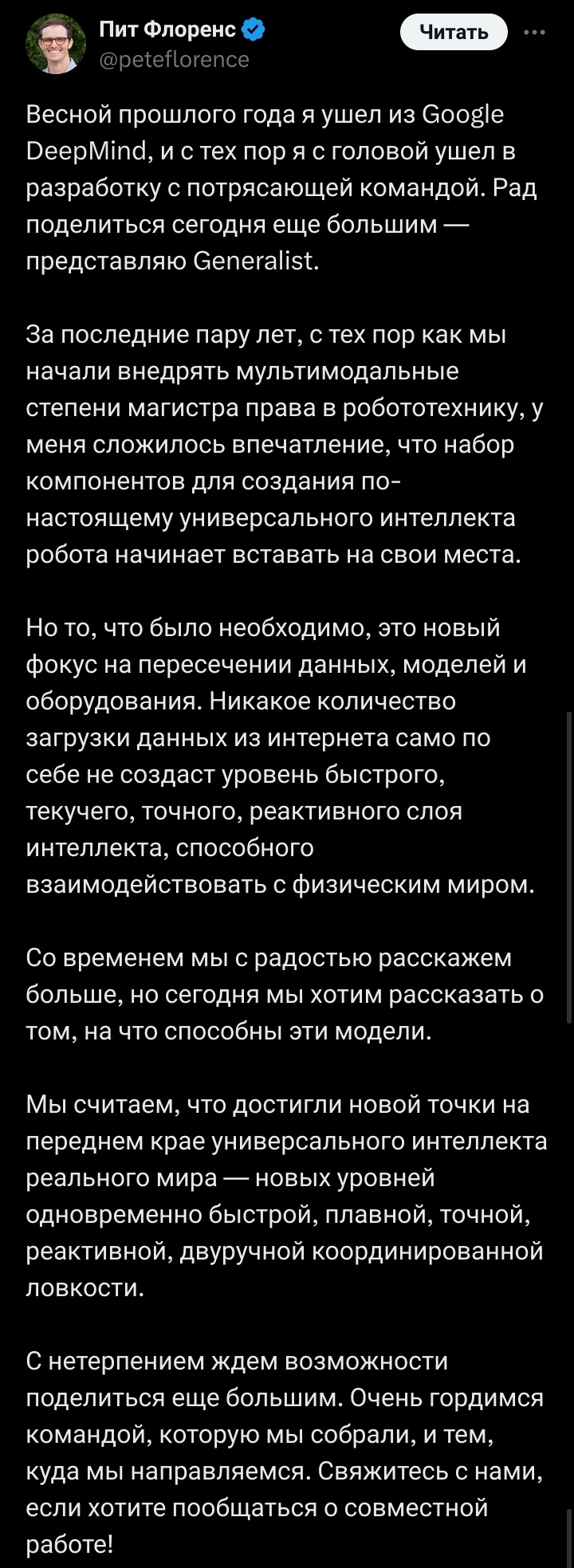 >>1253187 >Ремонты техники это последнее куда доберутся роботы лет через 40, так что для нас хватит ещё времени, пока нас полностью не заменят. Меня в моей работе полностью не заменят, пока не заменят трансформеры на что-то более стабильное и не сделают локальный мультимодальный инференс на кофемолке. Т.е. даже не в ближайшие 50 лет. И это аблсолютное большинство проф касается.