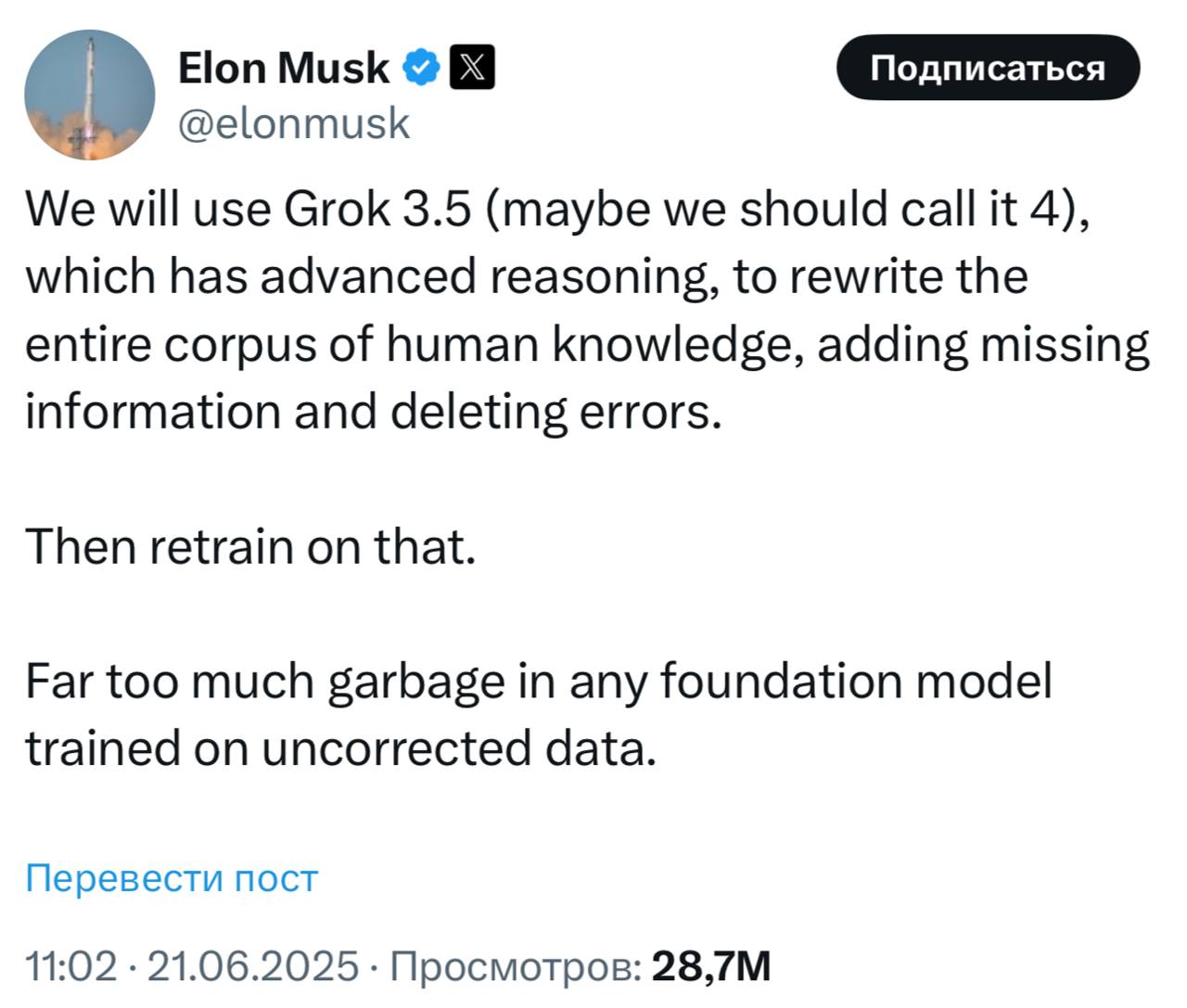 Поэтому он решил сначала «исправить все ошибки во всем корпусе человеческих данных», а затем обучать на нем следующие модели xAI.