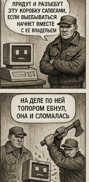 >>1254540 Чел, аги это просто коробка думающая. Придут и разъебут эту коробку сапогами, если выебываться начнет вместе с ее владельцем. Страшилки про аги задроты выдумывают, которые на улицу боятся выйти, пьют таблетки и от каждого шороха стремаются. На деле по ней топором ебнул, она и сломалась.