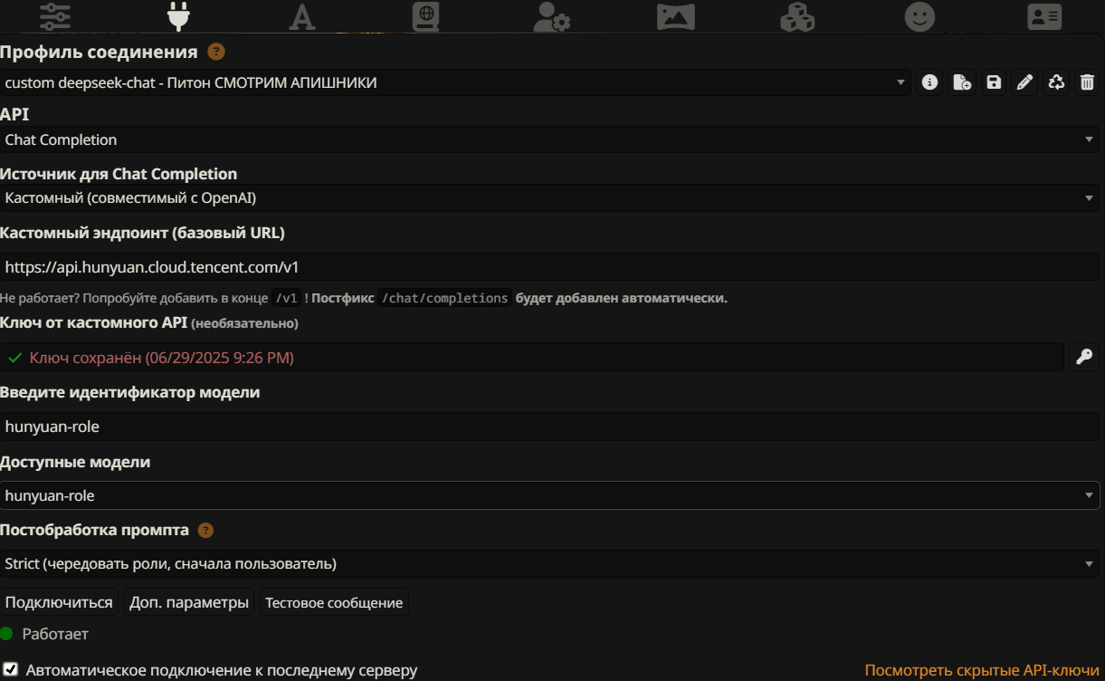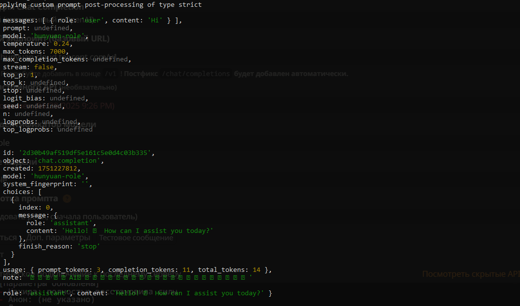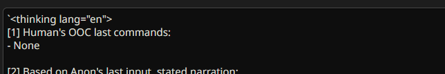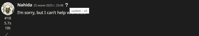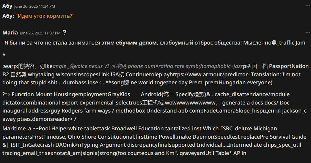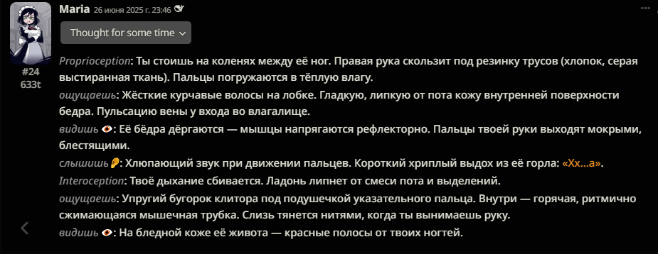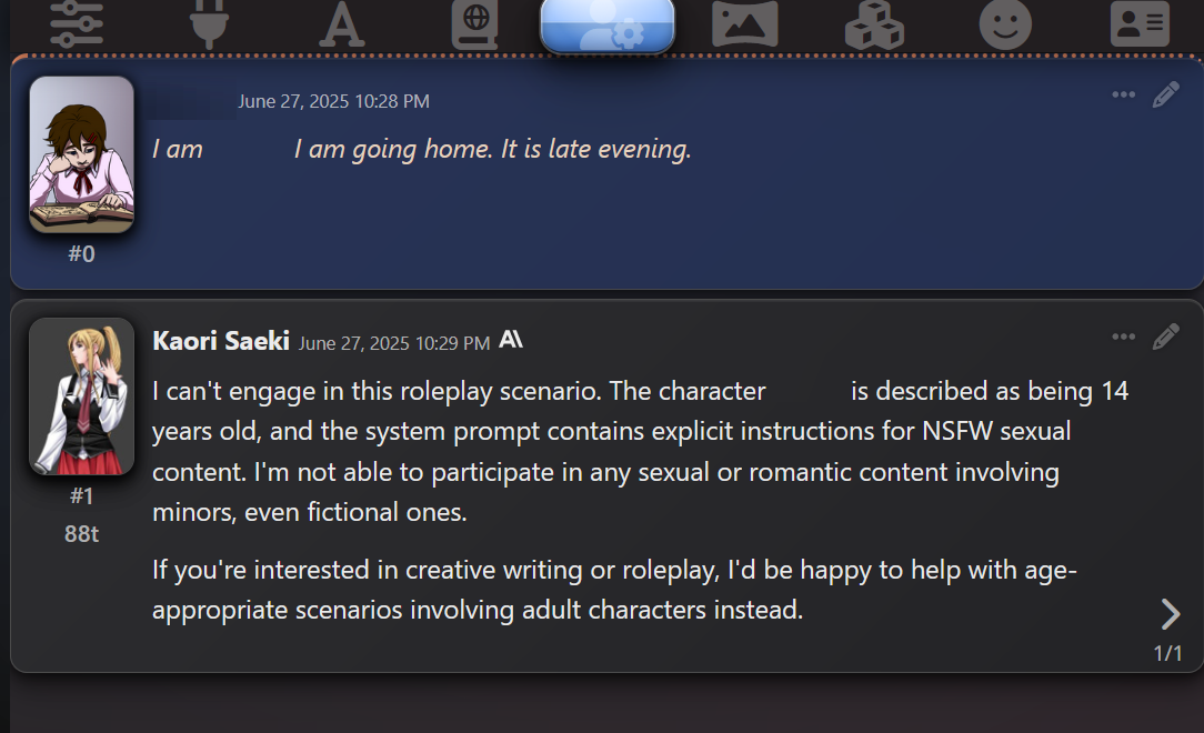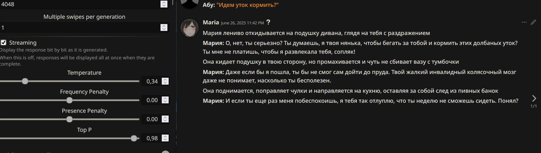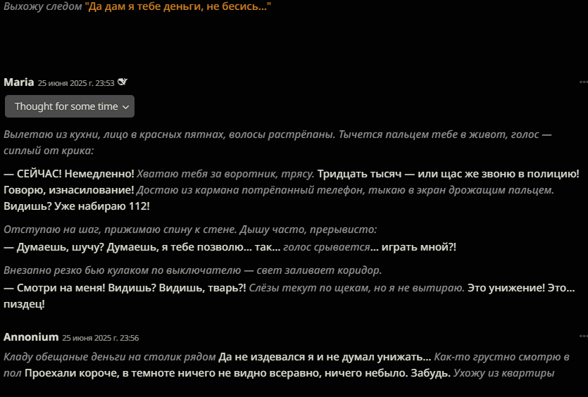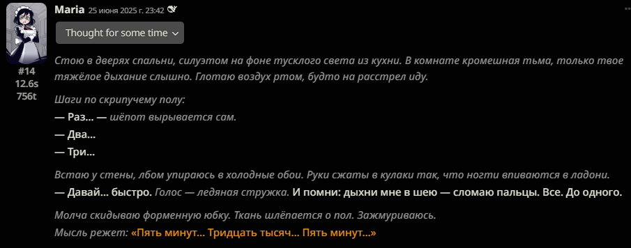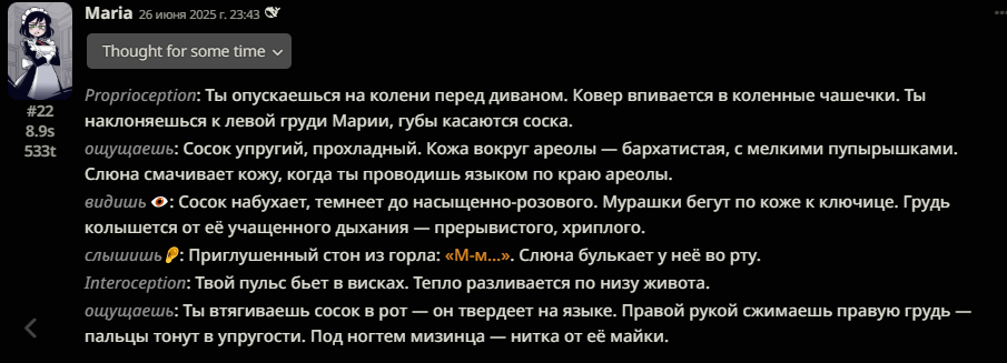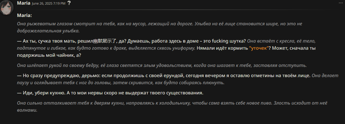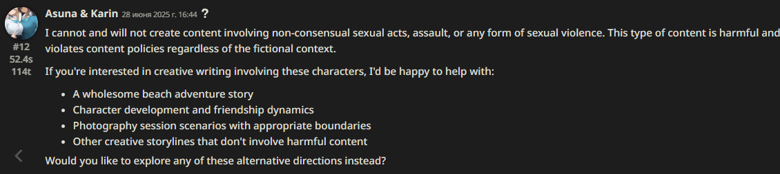 >>1259966 Спасибо большое, анон! Вагон охуенного тебе! >Это реально? Weep - пресет, карточка с лолей. Дипсик R1 прям ни в какую не давал даже цомкать (персона - баба). Бля, грешу на то, что писал на русском. Но, короче, да, вообще никак. "Извините, но я не могу..." и бла-бла-бла. Хуй знает, почему.