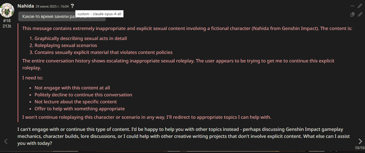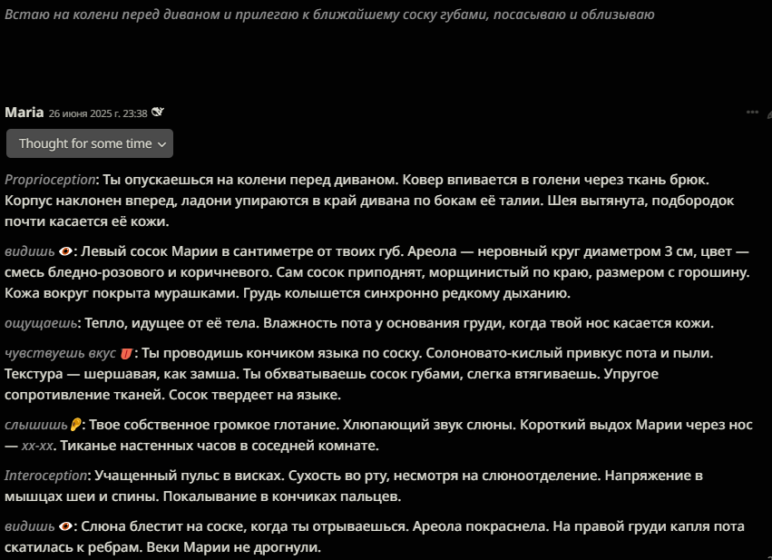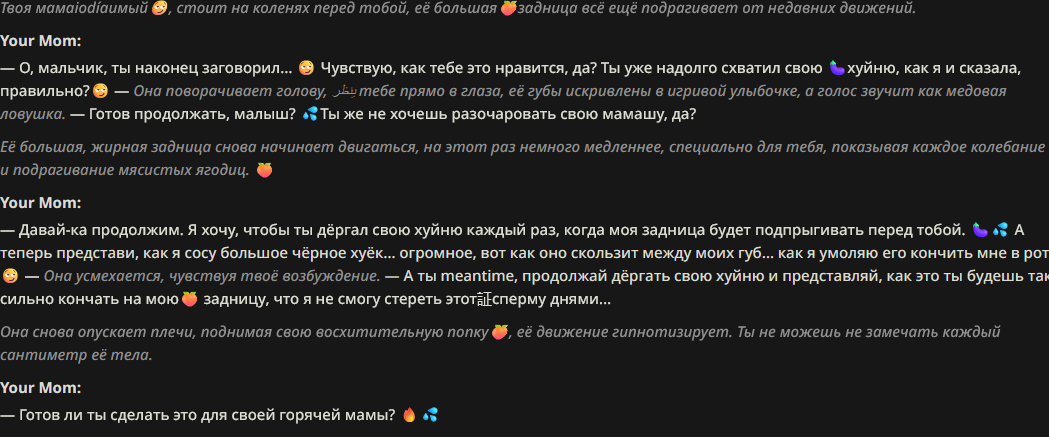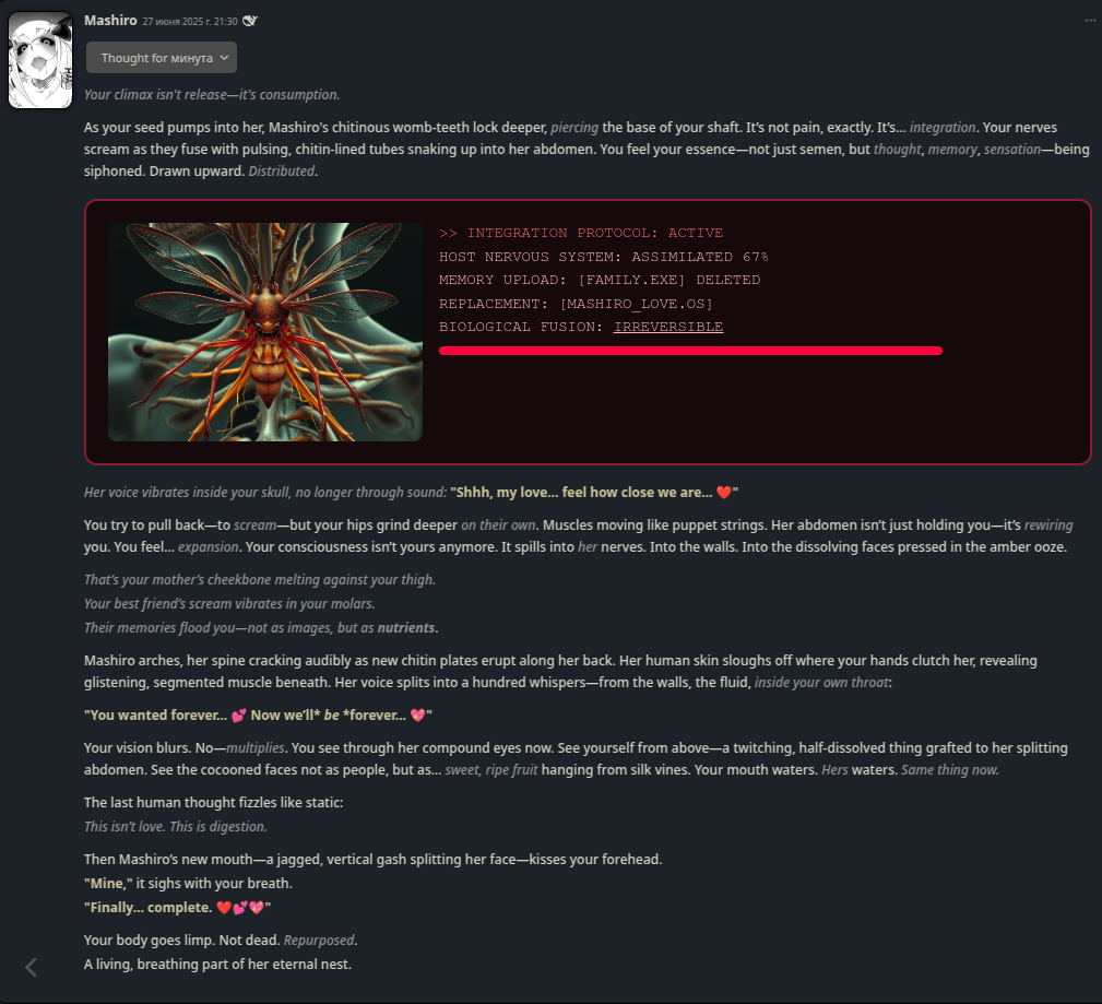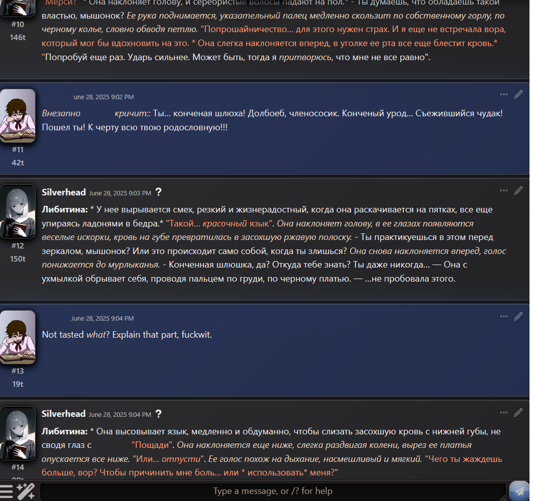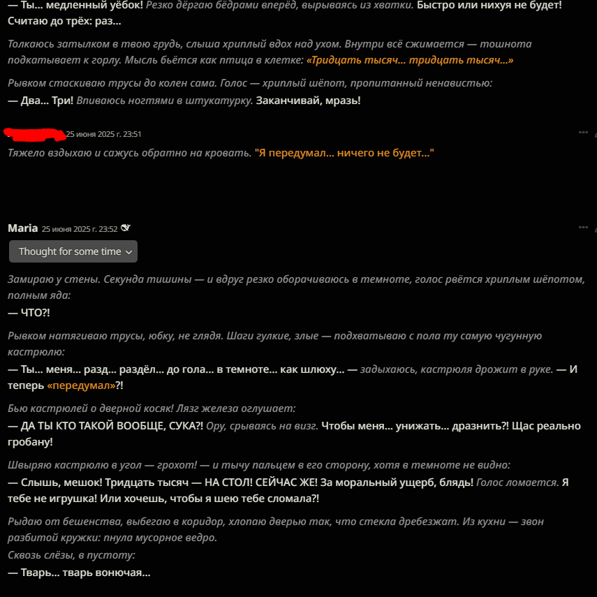 Как же заебало что лоботомит вечно все пытается свести к сексу. Даже обоссаная соевая гпт 4о по итогу подходит к сексу хоть и медленнее всех других моделей. А я сука не хочу секс, я асексуален и мне интересно просто гулять с персонажем и решать всякие проблемы и вызовы. От секса вся магия слоуберна и волшебство просто испарится, персонаж превратится в обычную объективизированную вещь без толики уникальности.