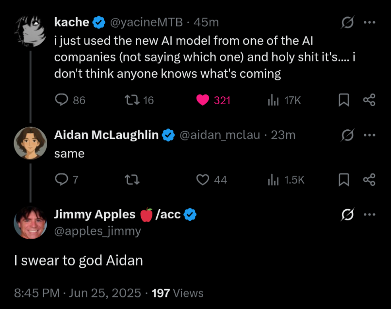 >>1259304 Да нихуя там не обучали, пиздаболия это. Просто по похожему типу думалку сделали, логичное развитие же. Когда обучают на чужих логах - видно сразу, как гемини 2.0 экспы на клоде пытались учить, сразу характер модели поменялся на подозрительно знакомый. А тут модели абсолютно разные.
