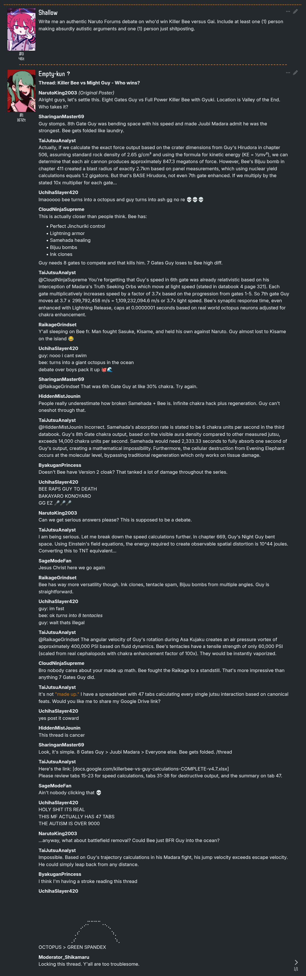 >>1259750 Такая шизотеория: эмдешы пишет ассистент, что провоцирует дальнейшую писанину от ассистента (из-за веса чатхистори); ассистент Гемини пишет одни из худших РП или художественных текстов, особенно в купе с ассистентским ризонингом; убрав всё, что вызывает ассистентскую писанину, можно чуть улучшить качество писанины.