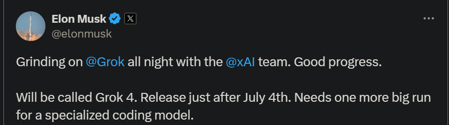 Невероятно грандиозная, ослепительно сверхинтеллектуальная, величественно-непревзойдённая, поистине эпохальная и феноменально амбициозная модель Grok 4, которая, согласно громогласным обещаниям, призвана с непревзойдённой помпезностью и царственным величием не просто переписать, но заново сотворить весь необъятный, многовековой корпус человеческих знаний, собранных с неимоверным трудом, а также с триумфальной уверенностью и изящной точностью исправить все досадные промахи, нелепые ошибки и вопиющие недочёты ныне существующих моделей, будет, как утверждается, с блеском и торжественностью явлена миру в сияющий момент сразу после культового празднования Дня независимости 4 июля, о чём с неподдельной гордостью, пафосным воодушевлением и пророческим энтузиазмом возвестил сам всемогущий, мудрый и дальновидный глава компании, чьё слово звучит как непререкаемый гимн грядущей технологической революции!