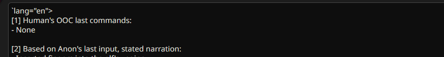 >>1256527 Такие случаи это 100% юзкейс примеров. Дай ему несколько примеров речи перса. Желательно сбалансированных, чтобы единственное общее у них это был стиль речи. И пометь их пояснением, что это именно примеры и их надо учить, а не повторять. Не юзай поле примеров в карточке, т.к. по разметке непонятно к кому они относятся и по дефолту в таверне они уплывают с историей. Суй примеры например в описание персонажа. >а сам язык подхватывается из гритинга, где уже идет как пример речь данного персонажа История вообще довольно нестабильный способ описывать что-либо, если ты ещё не понял. Факты в ней разрознены, двигаются по кривой контекста, и в конце концов выкидываются в мусорку. Хранит описания она плохо и непредсказуемо.