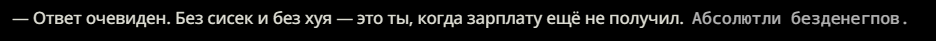 >>1259772 Теперь понятно, почему перед каждый ответом задержка в 4 минуты. 2 минуты ржут, одну думают над ответом, одну пишут и потом присылают по кусочкам, как будто компьютер генерирует.