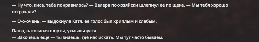 >>1259773 Потому что рп исключительно со шлюхами с хуевой биографией и прочими трудными психологически личностями для которых кекс должен быть работой и актом насилия или унижения. Она никогда не должна думать заняться сексом с человеком который ей действительно нравится, потому что это деструктивный акт, который просто обесценит что-то позитивное в жизни вернув в привычную парадигму. Это тот случай, когда соевый взгляд на вещь не просто правильный, а единственно верный.