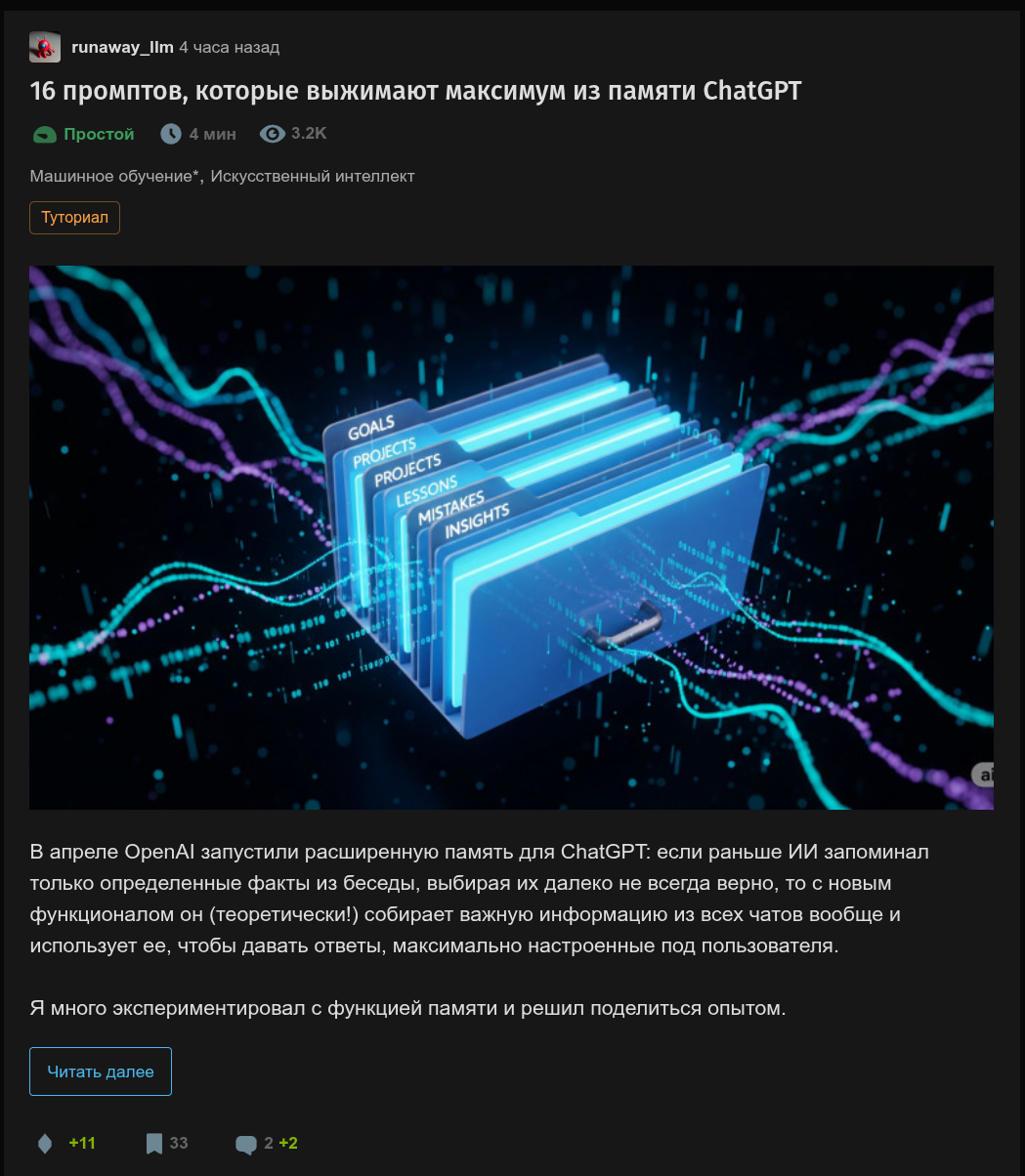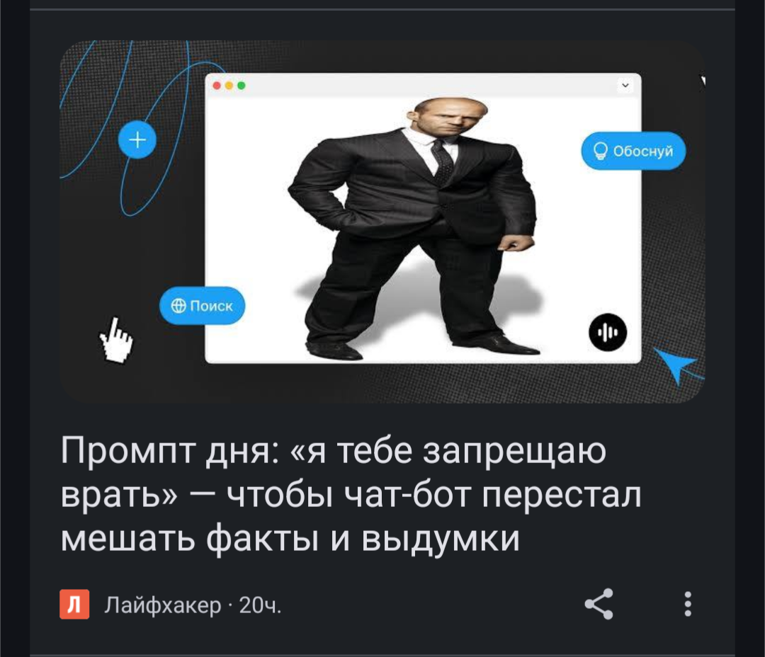 >>1262788 Сегодня с отцом говорил и объяснял ему принципы работы ЛЛМ, выученные в школе Котошиза. Он не совсем понял, потому что особо ими не пользуется, только по словам людей с которыми он общается и по тому, что они ему показывали (точнее примерно понял, просто в терминологии разошлись из-за отсутствия опыта пользования), но ему понравилось. Когда сам попробует заниматься с ллмками, подскажу ему БАЗЫ ПРОМПТИНГА.