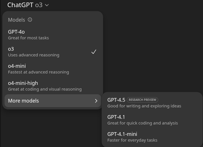 >>1260411 Так это не для РП, у них всё для кодинга и ризонинга >edges out one of the models in the ChatGPT dropdown Вот тебе все модельки в dropdown (В главном и More models). Если они только про главный, то возможно что эта модель уровня GPT 4.1 или (скорее) o4 mini локально. Если они про оба, то GPT 4.1 mini.
