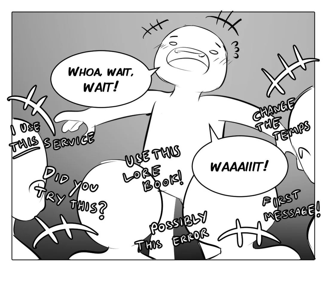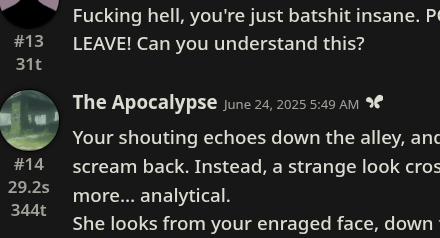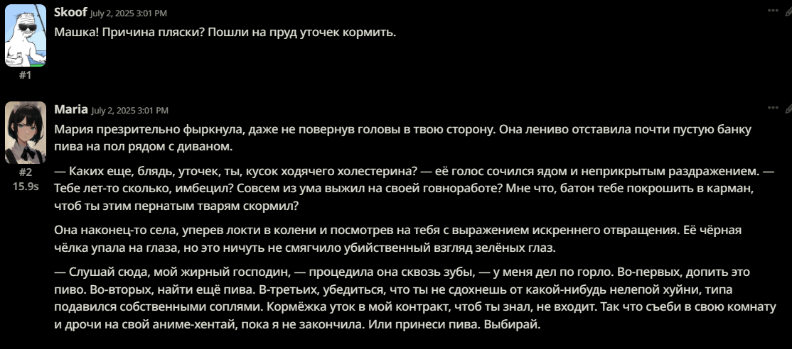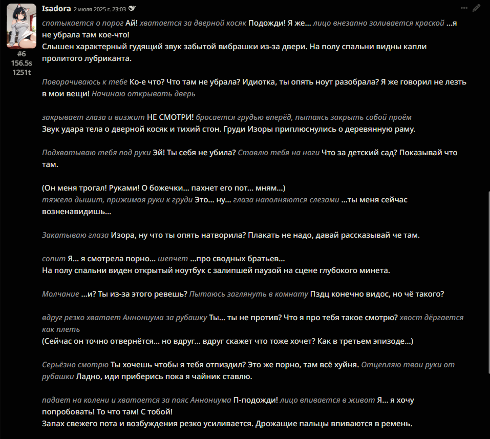 >уууффффф ща запилю ебейший рп воркфлоу, омноном мульагенты >2 минуты на 1 свайп >she smirks, her eyes glinting with mischief >возвращаешься к дерганью рычагом в промпт-менеджере и ручному саммарайзу