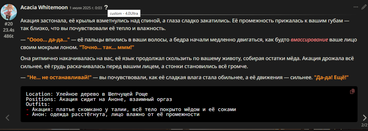 Мои выводы пока что: Муншот ебет вообще всех в качестве и свежести прозы но карточку держит средне. Дубао хорошо держит карточку и чуть умнее и в целом просто достойная альтернатива но проза чуть более стандартная, правда все еще в лучшую сторону. Обе ощущаются более живыми и приземленными чем западные сетки и на обеих отсутствует сейфити. Позитив байяс в наличии, не слишком сильный но присутствует, вероятно решается пресетом. Ассистентские корни замечены и там и там, но на дубао чуть послабее, он с большей вероятность высрет безжоповский фанфик. Но обе сетки жить не могут без юзера, возможно фиксится пресетом.