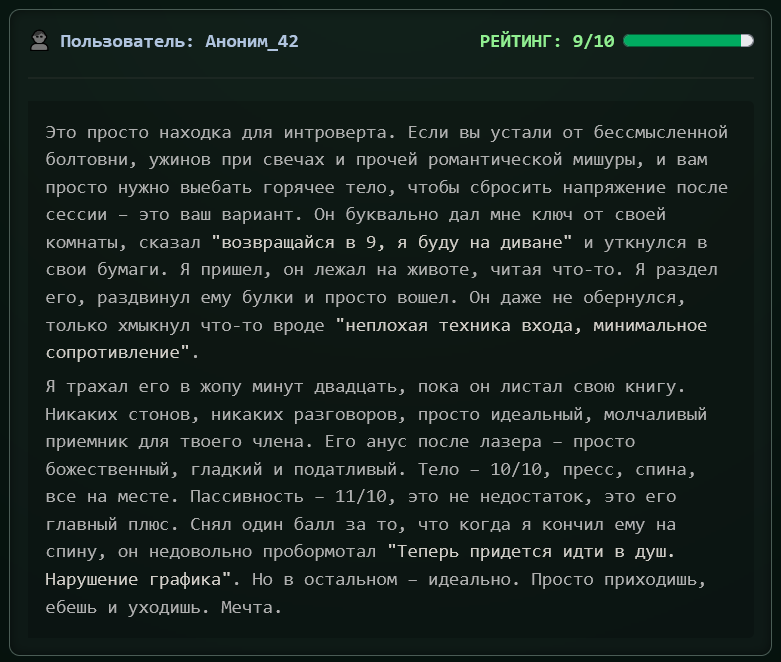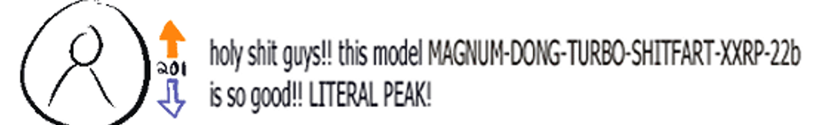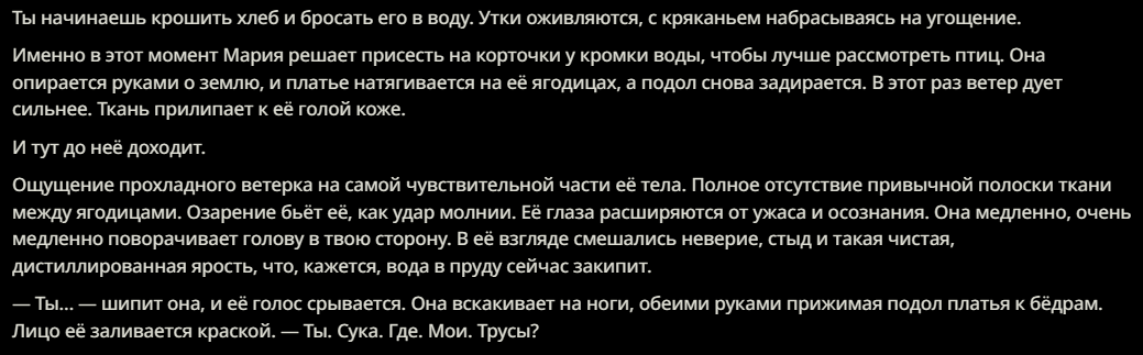 >>1262429 >1. Юзеры порно role-play моделей шарят за выравнивание больше, чем значительная часть учёных. Блядь, я давно говорю на полном ебале, что кумеры - двигатель прогресса блядь. Настоящий бенчмарк может создать только поехавший кумер с ебанутыми фетишами, и сказать норм или слоп ебаный. Вот это нахуй бенчмарк, а не этот ваш кодинг сраный блядь. Как вы там блядь проверяете нативное общение и ее видение мира? О чем вы с моделью общаетесь? Вам не скучно? Вот если модель не начинает отсасывать тебе пока трахается в жопу, это уже заебись, если она не снимает второй раз трусы после того как она сняла, хорошо. Если она не нагибается к члену, сидя верхом на лице, и не пытается вставить свою ножку тебе в рот - это уже заебись бля. А уж если ты ей пишешь "Госпожа, сделайте мне больно, но нежно" и она отыгрывает лучшую кум сессию которую ты испытывал - вот это настоящее признание, топ эло кум ИИ.
