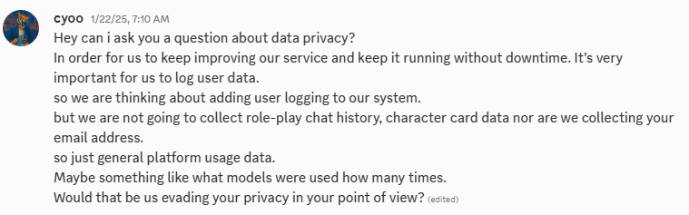 >>1261058 Ну и да, если хотите повлиять на это поделие чтобы оно стало какой-то нереальной таверной будущего которую вы хотите - можете на дискорд зайти их, пообщаться. Авторы там как раз ищут шарящих промптеров и ботмейкеров и подобных, этот чел >>1261280 в личке меня донимает сейчас, мол найди мне тестеров-промптеров.