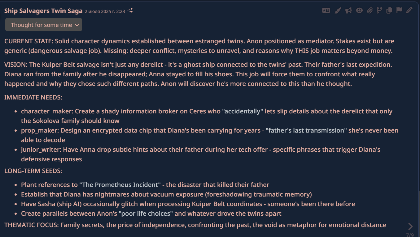 >>1260759 Я согласен, пердолингом задержку можно забороть. Вообще по отдельности почти каждую проблему можно пердолингом решить в таверне. Я сам успешно промптил внешние блоки и т.д. (например пилил научно-технического консультанта для сай-фай сеттинга, который предугадывал какие концепты могут понадобиться, описывал их простым языком и это скармливалось основной сетке). Проблема в том что если ты захочешь хотя бы две-три такие вещи вместе работать то просто охуеешь. Вот например я хочу чтобы поддерживался ворлд стейт - то есть мир как-то помимо чатика существовал, персонажи что-то делали, и т.д. Плюс хочу разделить условно планировщика и писателя - первый чисто идеи по сюжету накидывает и заведует миром, второй уже пишет что происходит в поле зрения ГГ. Но планировщик должен тоже быть разделен на две части - первый агент должен максимально широко набрасывать идей, а второй отсеивать всякую дичь и шизу и компоновать во что-то вменяемое.