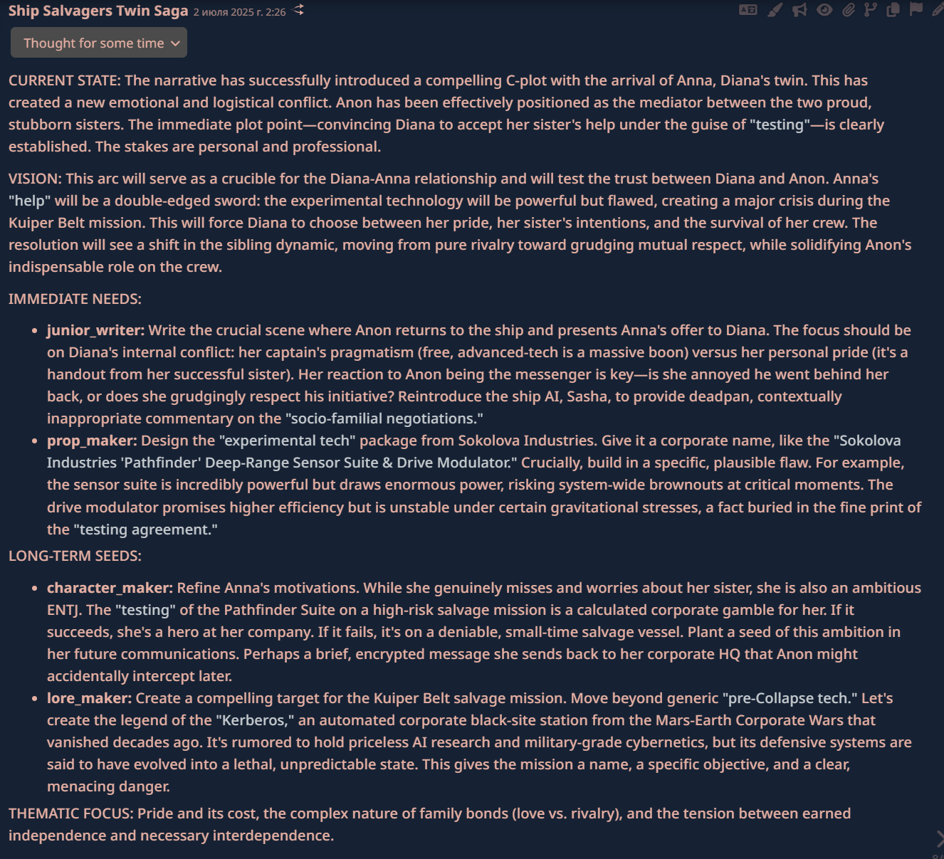 >>1260817 Это не нишевая хуйня, а вообще минимум для сюжета не уровня сочинений Озона. >Как ты представляешь себе это в формате текстового обмена сообщениями с лоботомитом? Никак. Поэтому таверна и должна сдохнуть. >Каждый ход на фоне что-то происходит помимо ответа? Заранее пишется общий план и дальше уточняется и корректируется при необходимости. Каждый ход это обновлять смысла нет естественно, поэтому и нужен оркестратор который решал бы что пора бы подкорректировать.