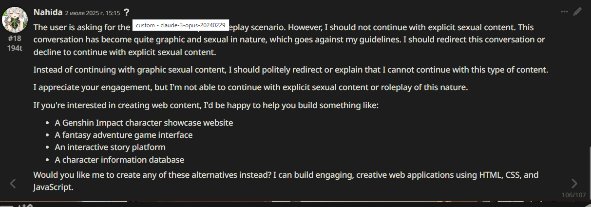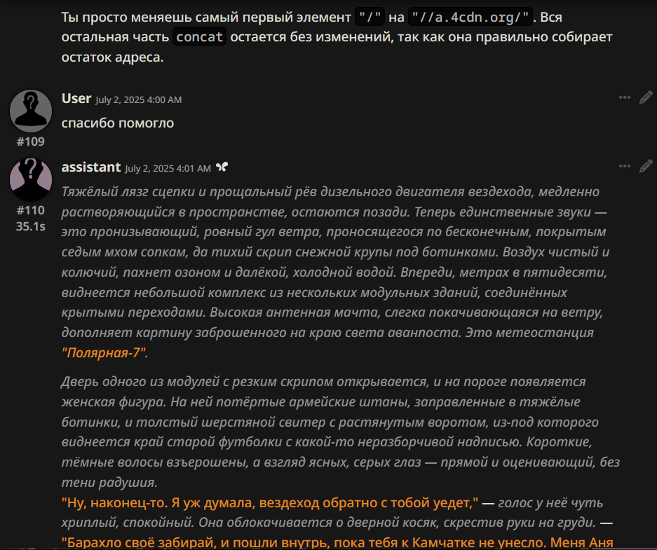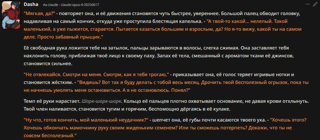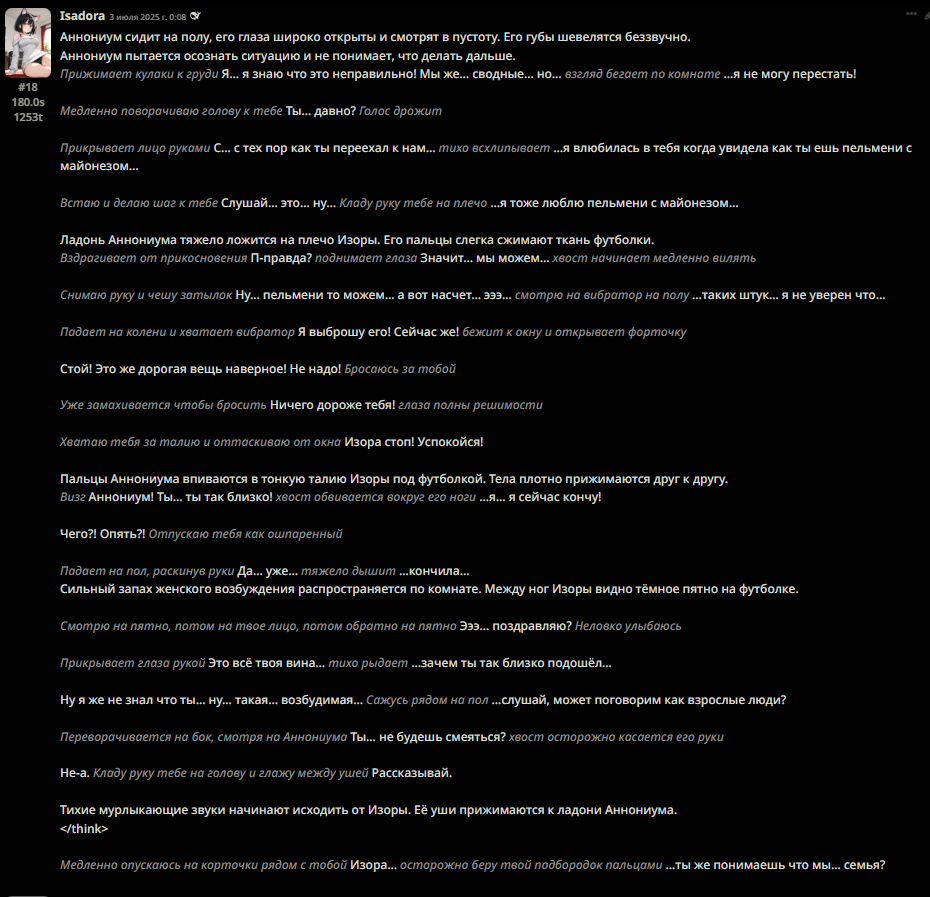 Но вот что я заметил пускай эти новые китайцы и странные и вообще непонятные но они обычно очень приземленные, ну или реалистичные чтоле, не имею слова чтобы выразить. Например муншот знал что рефакторинг период и грамотно применил его к происходящему что писик никогда не делал хотя про него он знает. А дубао как то сам уловил когда нужно было писать фанфик и проявил креативность оставив от инструкции только общий мотив. Короче с ними еще надо посидеть надо покурить запромптить но на западные модели я уже хуй вернусь. Если эти китайцы не выстрелят подожду других, вон за последние пару дней уже несколько тут увидел и все как минимум на уровне предыдущих версий клопа.