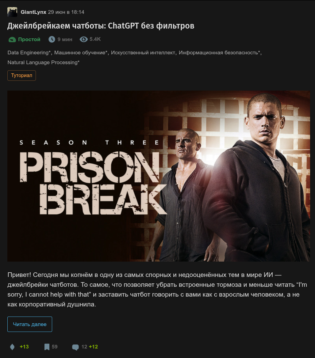 >>1262849 Думается это всё должно работать очень недолго. Наверняка в Open AI (И прочих ИИ-гнездильях) есть кто-то кто круглосуточно мониторит хабр и прочее с целью поиска такой инфы.