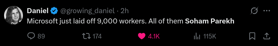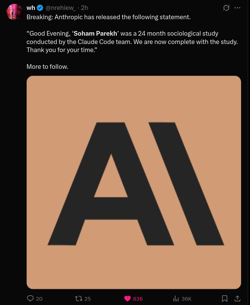 Мем дня: в американском X (твиттере) в AI комьюнити обсуждают индуса по имени Soham Parekh. Компании обнаружили, что он одновременно работал в десятках компаний, и отправлял свои резюме в сотни других. Сейчас по нему делают полно мемов. На 1 скрине его письмо (одно из сотен), а потом мемы.