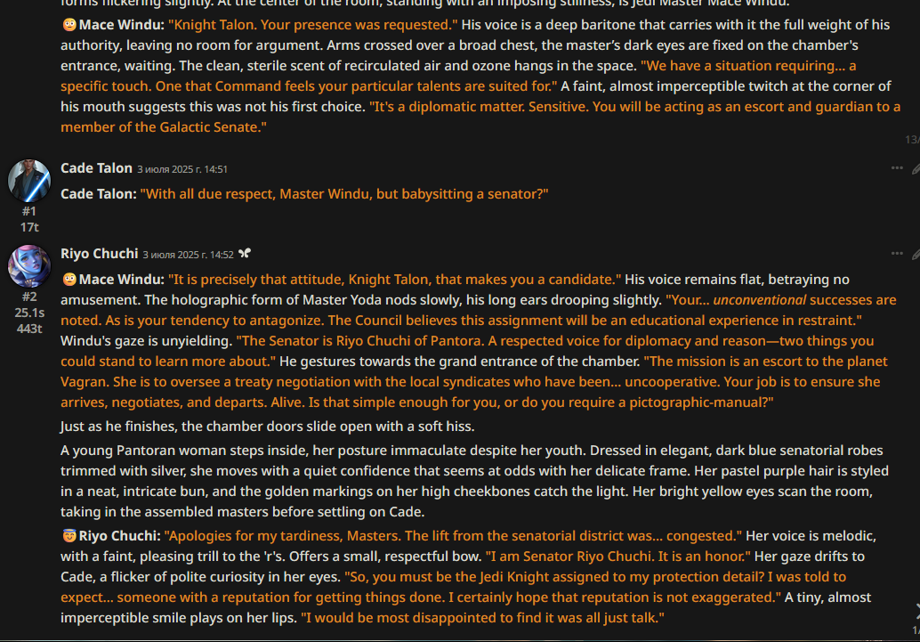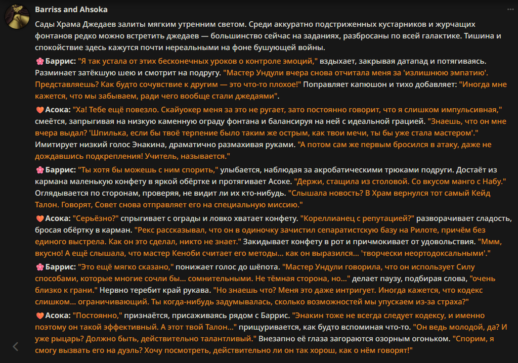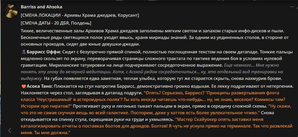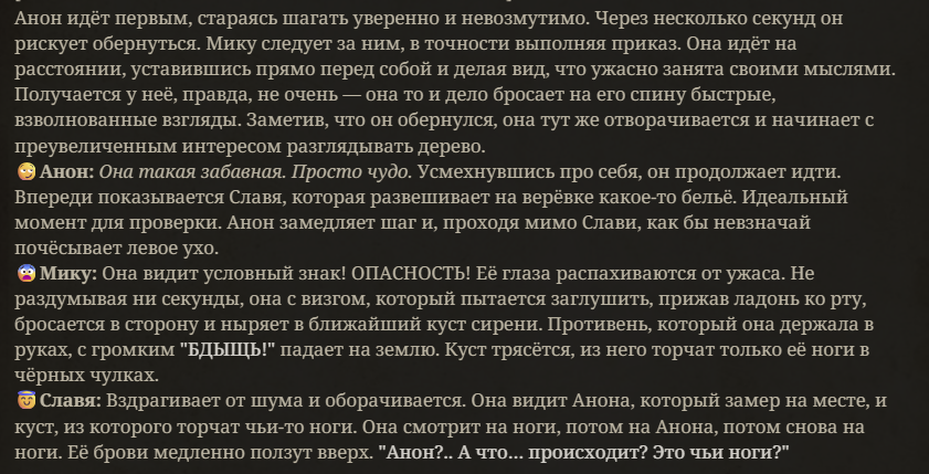>>1264096 На безжопе тоже можно большие сообщения писать, если хочется в какие-то моменты. Но там из-за большей интерактивности маленькие реплики тоже хорошо заходят.
