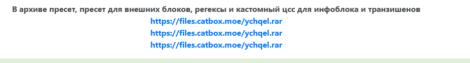 >>1263667 Так все уже внешними блоками пользуются давно зачем пресет захламлять ещё инфоблоком вон ремиксер даже убрал из пресета его оставил только внешние