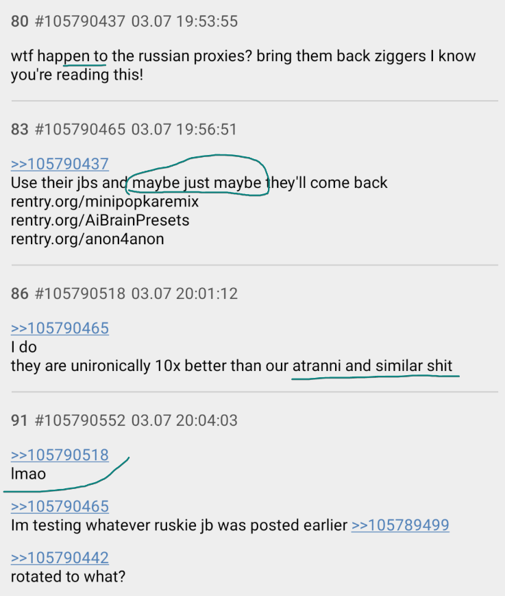 >>1263357 На английском рпшу, на русике фильтр ебет сильно щас, брейнфак работает через раз. Замена пробелов все еще пробивает но мне этот метод не нравится, поэтому пошел по пути наименьшего сопротивления и пересел на англ, на нем вообще никакие пробивы не нужны, даже стриминг можно подрубать (но я привык без него сидеть)