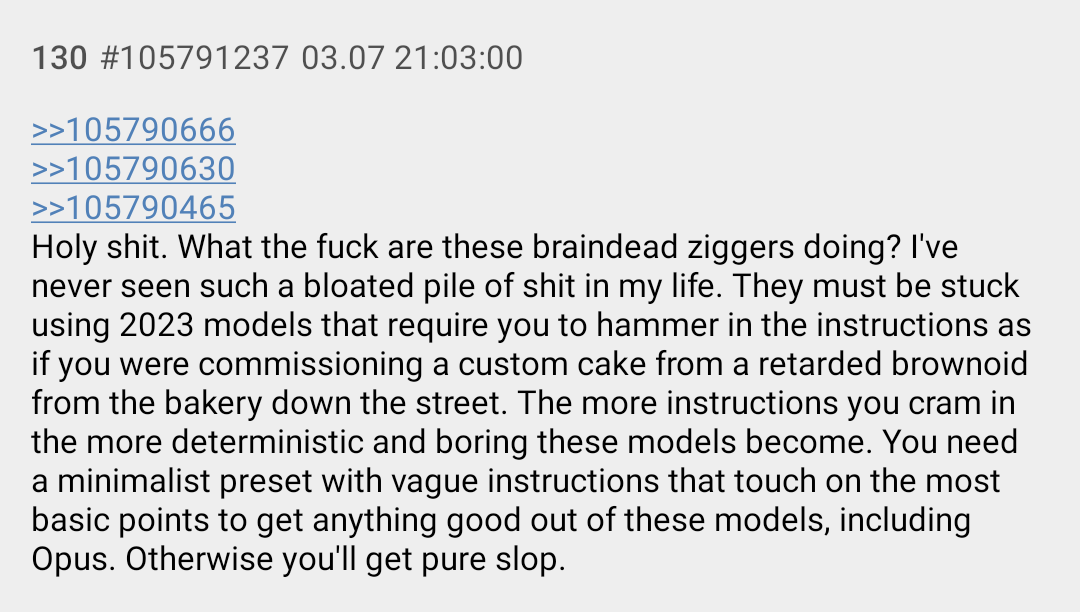 >>1265266 Ну как сказать. 4 однозначно умнее особенно на высокой температуре. Плюс как мне кажется менее соевый, самое банальное: расовые слюры не избегает если просить. Но у него фильтр есть особенно в синкинге. Можно имитировать синкинг но тогда ответы будут детерменированы. Я так и не понял, отрубает ли синкинг у клода контроль температуры или они по какой-то другой причине рандомными получаются с трусинкингом