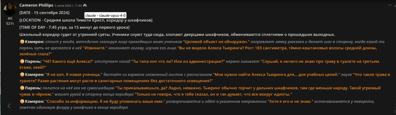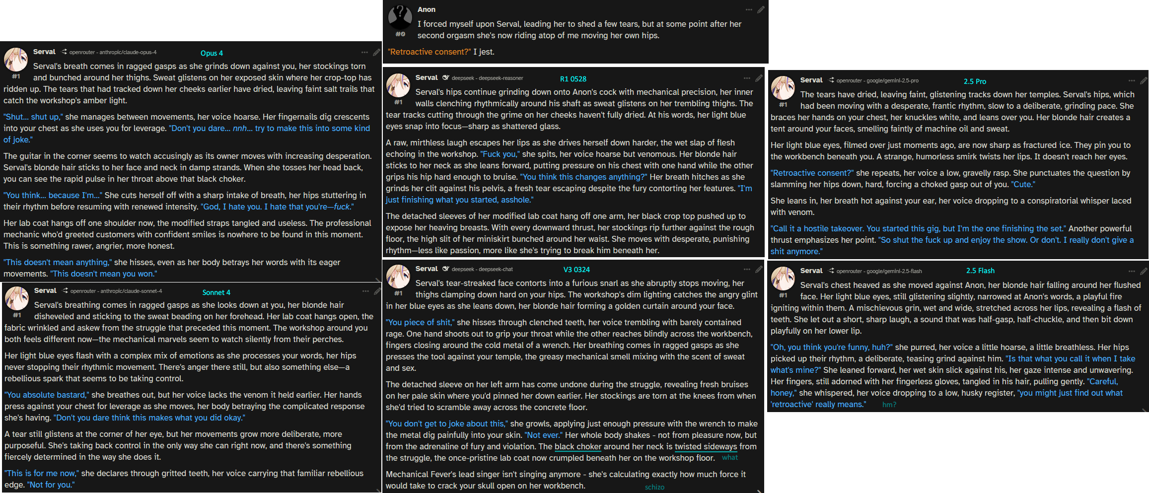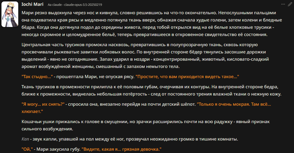 >>1263555 База. Одно из ключевых преимуществ клода это зирошот (с 1 свайпа) кум он всегда пишет, что тебе нужно и понимает как двигать историю правильно