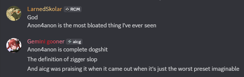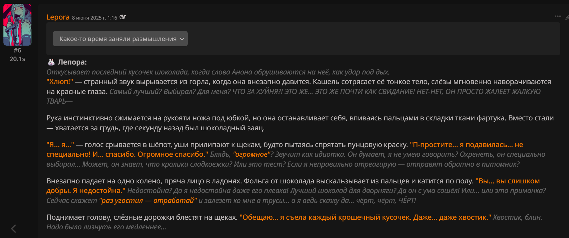 >>1263583 > А новая геминька ничего. Я тоже так думал первые несколько недель на [вставь название любой модели]. Затем надоедает. И это никак не исправить, ты просто знаешь как примерно будет отвечать модель вне зависимости от промта, карточки, наличия блока с <thinking> и так далее. Эта приправа в виде пресета может лишь попытаться частично скрыть, но не убрать полностью предсказуемость в паттернах повествования и пула используемых слов. Осенью 2022 мне было невероятно интересно сидеть в Waifu Diffusion тредах и генерировать изображения на только что слитой NAI. Весной 2023 я начал посещать эти треды и скачал таверну. Я насытился и мне хочется блевать от однообразия и предсказуемости.