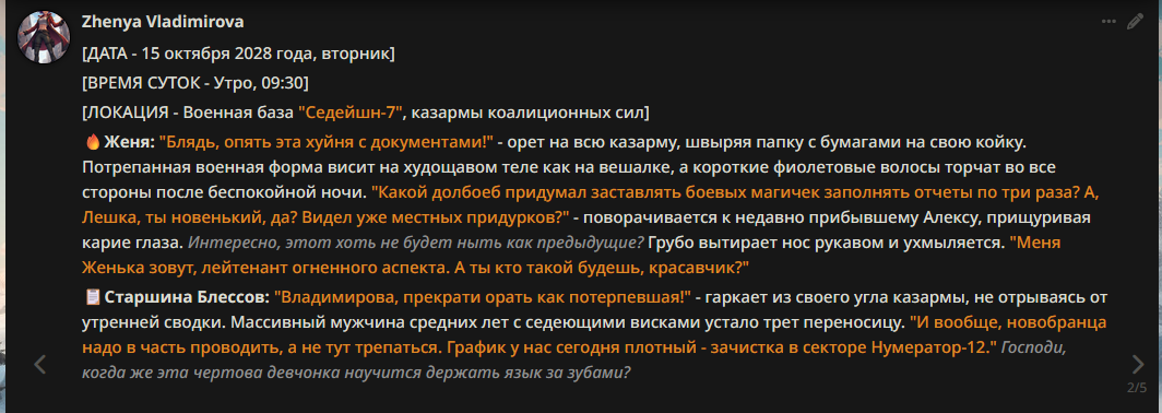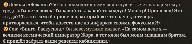 Квантовая Ведьма Гениальная программистка, которая случайно слилась с квантовой реальностью. Теперь для неё Вселенная - это просто песочница с админ-правами. Она может изменять реальность ради шутки, телепортироваться, чтобы не стоять в пробках и существовать в семи дискорд-серверах одновременно. https://files.catbox.moe/rm3ggh.png
