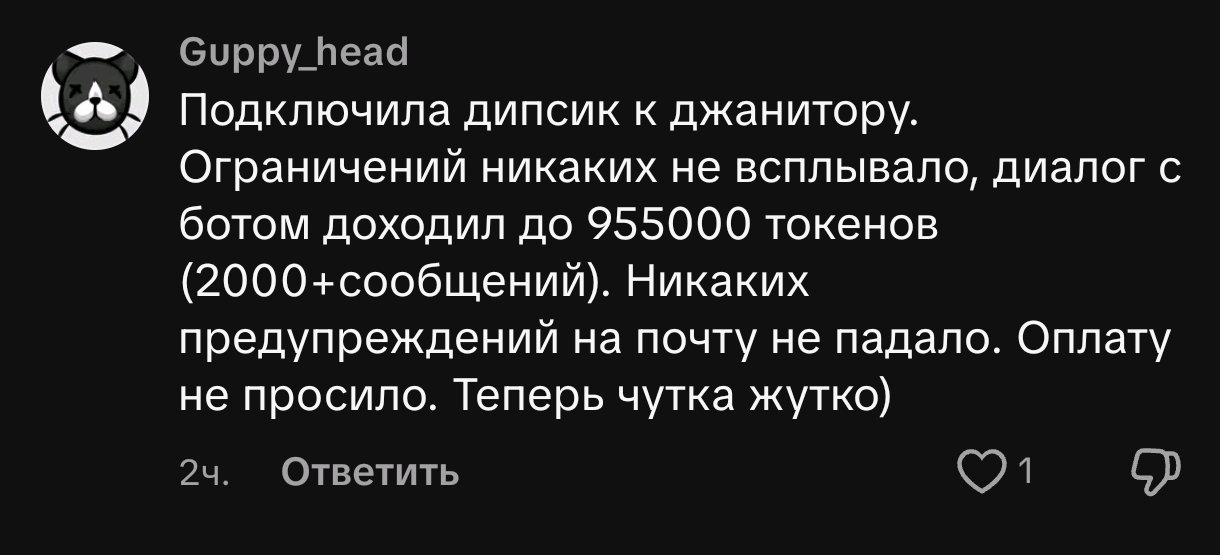 >>1263607 Ну тут ты запизделся, у гемини с памятью проблем нет никаких, скорее ты что-то забудешь чем гемини. Единственный нюанс, в таверне сейчас лорпуки с геминей как-то хуево работают, иногда может тупо не подхватиться, в таком случае просто свайпай и всё.