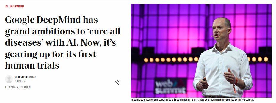 Isomorphic Labs (ответвление Google Deepmind) готовится к испытаниям препаратов, разработанных с помощью AlphaFold, на людях. В 2024 году Isomorphic договорились о сотрудничестве с крупнейшими фармацевтическими компаниями Novartis и Eli Lilly, а в 2025 получили $600 миллионов инвестиций. Они нацеливаются на онкологию и иммунологию и надеются ускорить вывод лекарств на рынок. https://fortune.com/2025/07/06/deepmind-isomorphic-labs-cure-all-diseases-ai-now-first-human-trials/