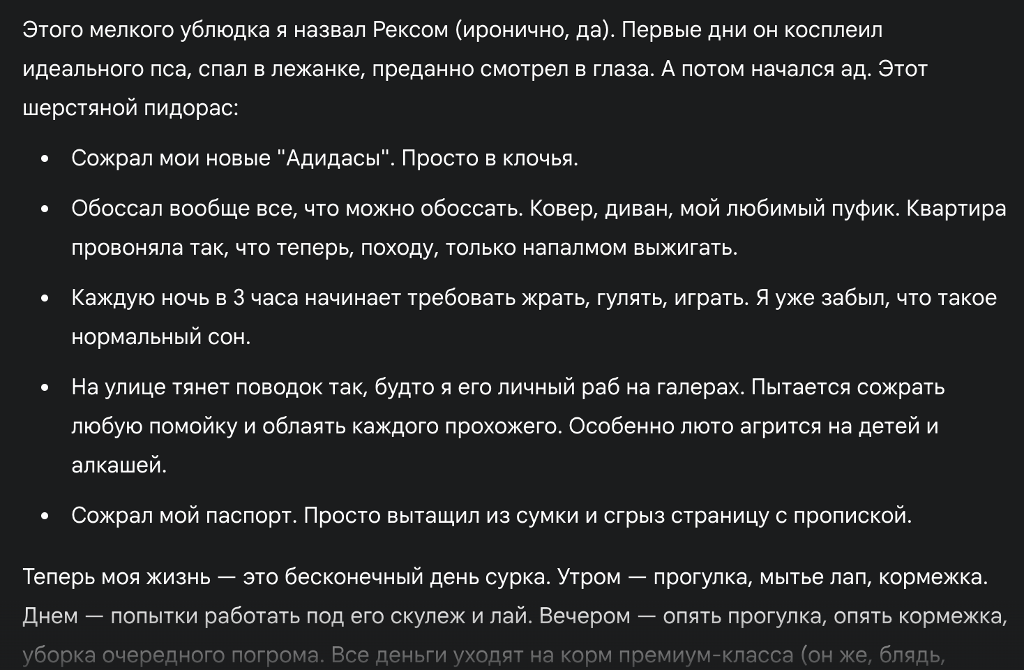 1. Анон №1269544 ("Пикейный Жилет") - Стиль: Эпичный, но истеричный рант с кучей мата и метафор ("дохлая шлюха в канаве"). Пытается выдать эмоции за анализ, но тонет в гиперболах. Кажется, что человек реально ненавидит ИИ и Маска. - Прозвище: Пикейный Жилет — за пафосный выплеск желчи, как будто он в жилете на трибуне.