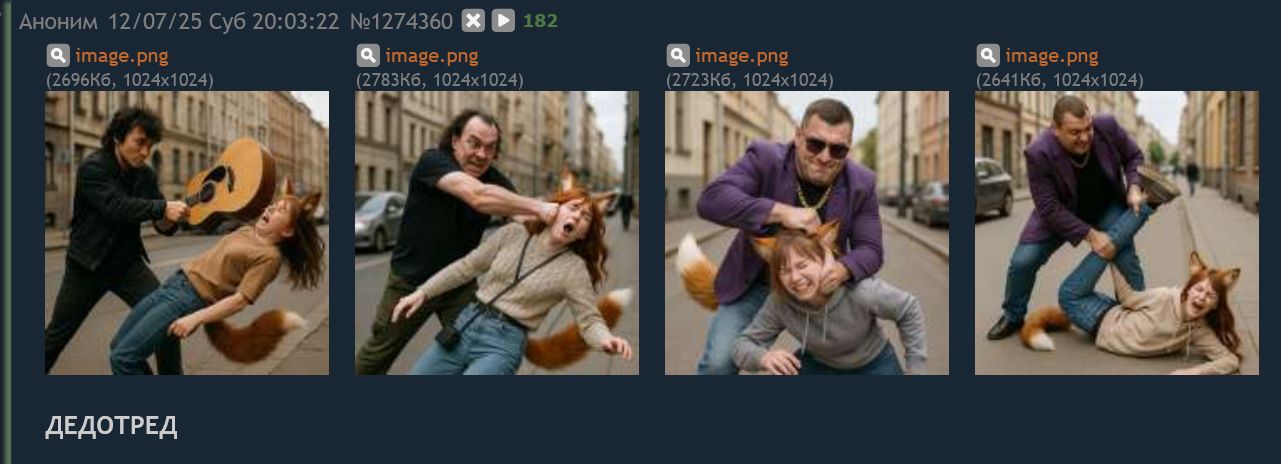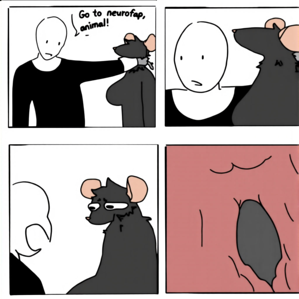 В ответ на это, недовольные аноны из SD-треда начали вайпать nai-треды генерациями дедов, жрущими говно. Это продолжалось неделями, и моча особо не вмешивалась - нейротреды тогда вообще не чистили от вайпов. В aicg-тредах тоже была драма с шапковойнами, параллельными тредами и взаимными вайпами.