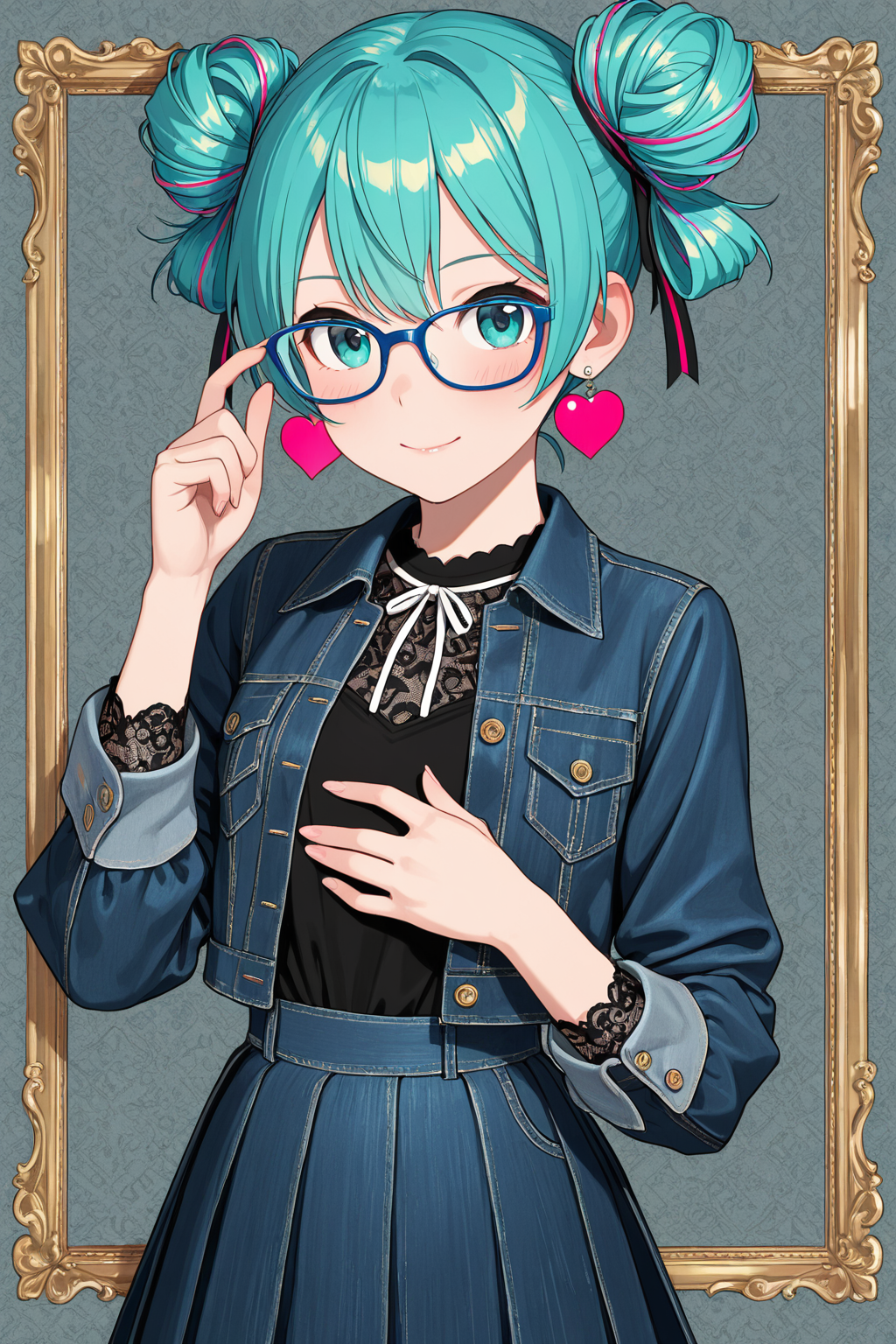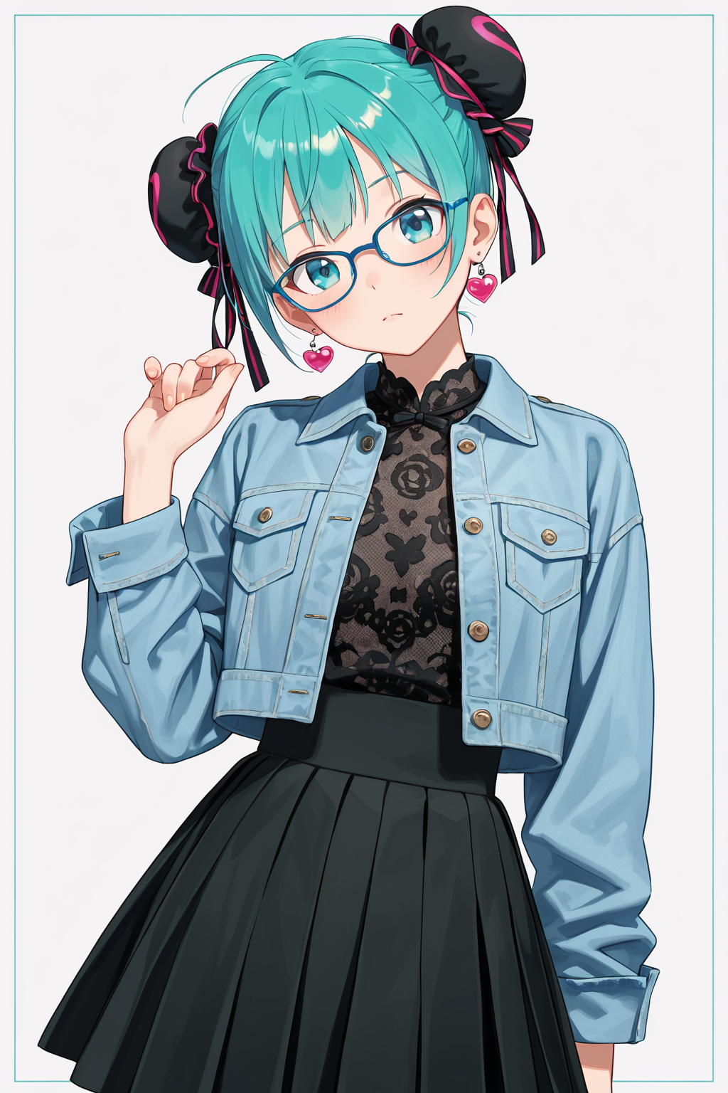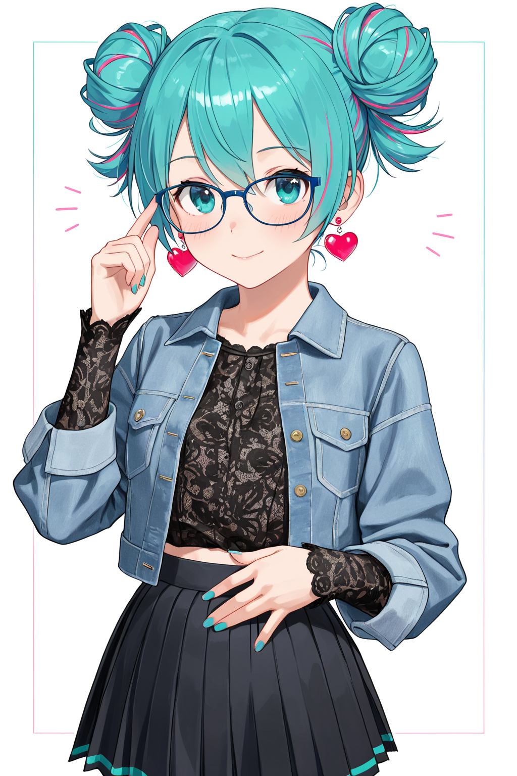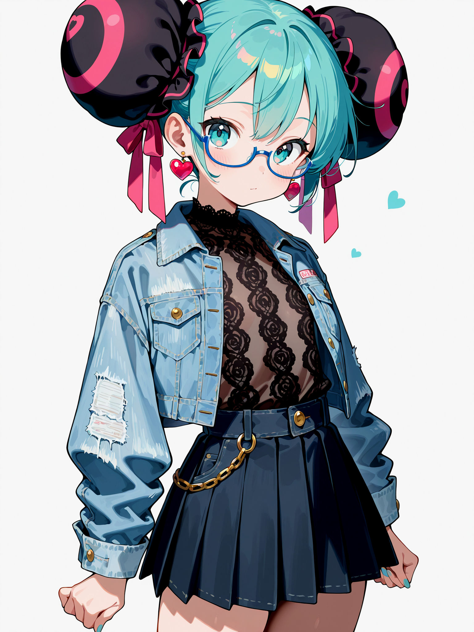 Позитив: >masterpiece, best quality, pastel colors, >1girl, solo, cowboy shot, >hatsune miku, cute face, short hair, double bun, bun cover, hair ribbon, big hair, oversized headgear, big headgear, heart earrings, big earrings, blue glasses, under-rim eyewear, >flat chest, >denim jacket, black miniskirt, high-waist skirt, pleated skirt, black shirt, lace shirt, see-through clothes, tight clothes, >white background, simple background,