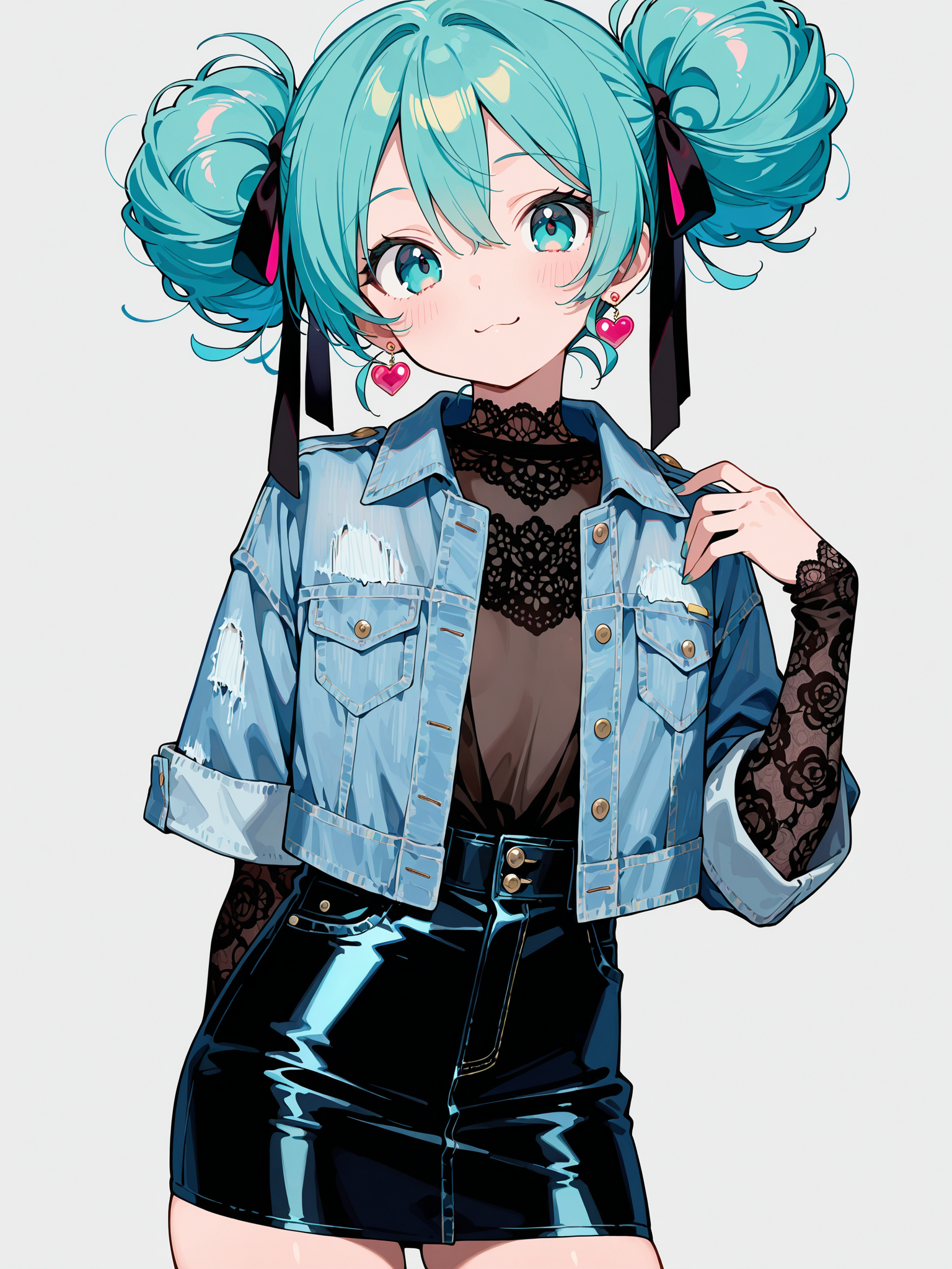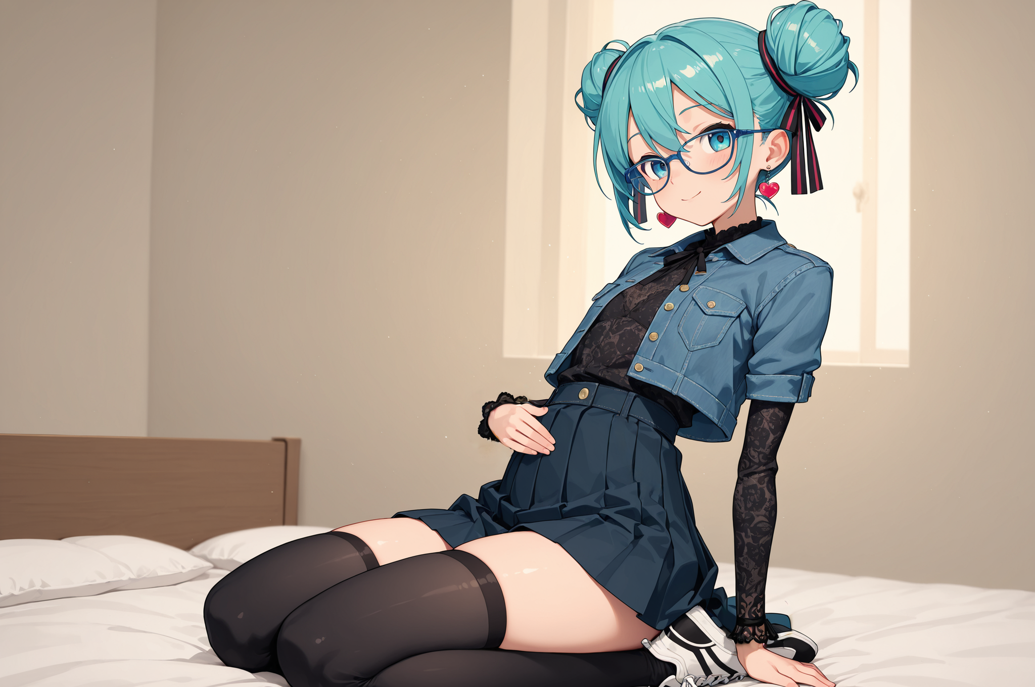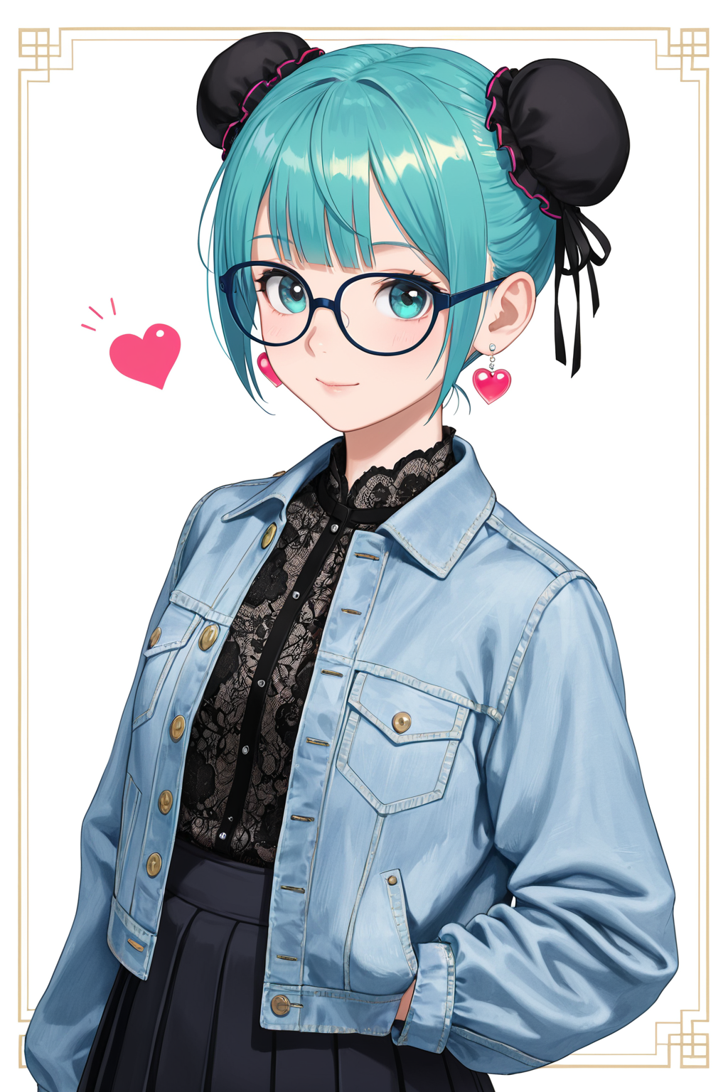 Позитив: >masterpiece, best quality, pastel colors, >1girl, solo, cowboy shot, >hatsune miku, cute face, short hair, double bun, bun cover, hair ribbon, big hair, oversized headgear, big headgear, heart earrings, big earrings, blue glasses, under-rim eyewear, >flat chest, >denim jacket, black miniskirt, high-waist skirt, pleated skirt, black shirt, lace shirt, see-through clothes, tight clothes, >white background, simple background,