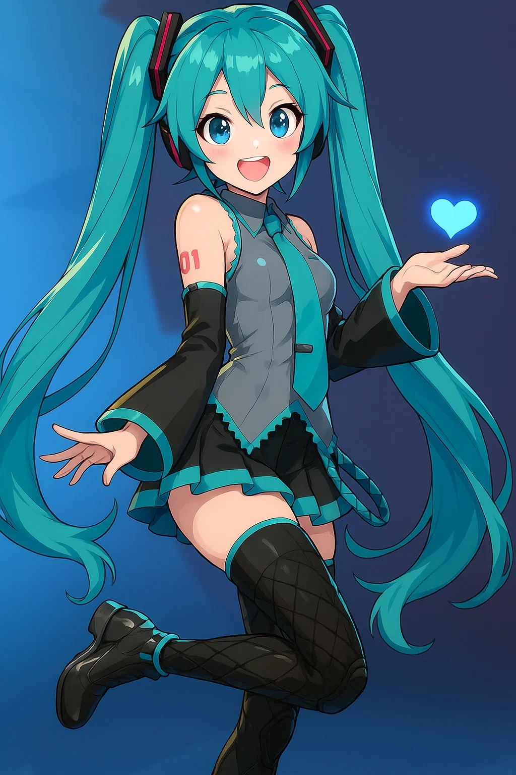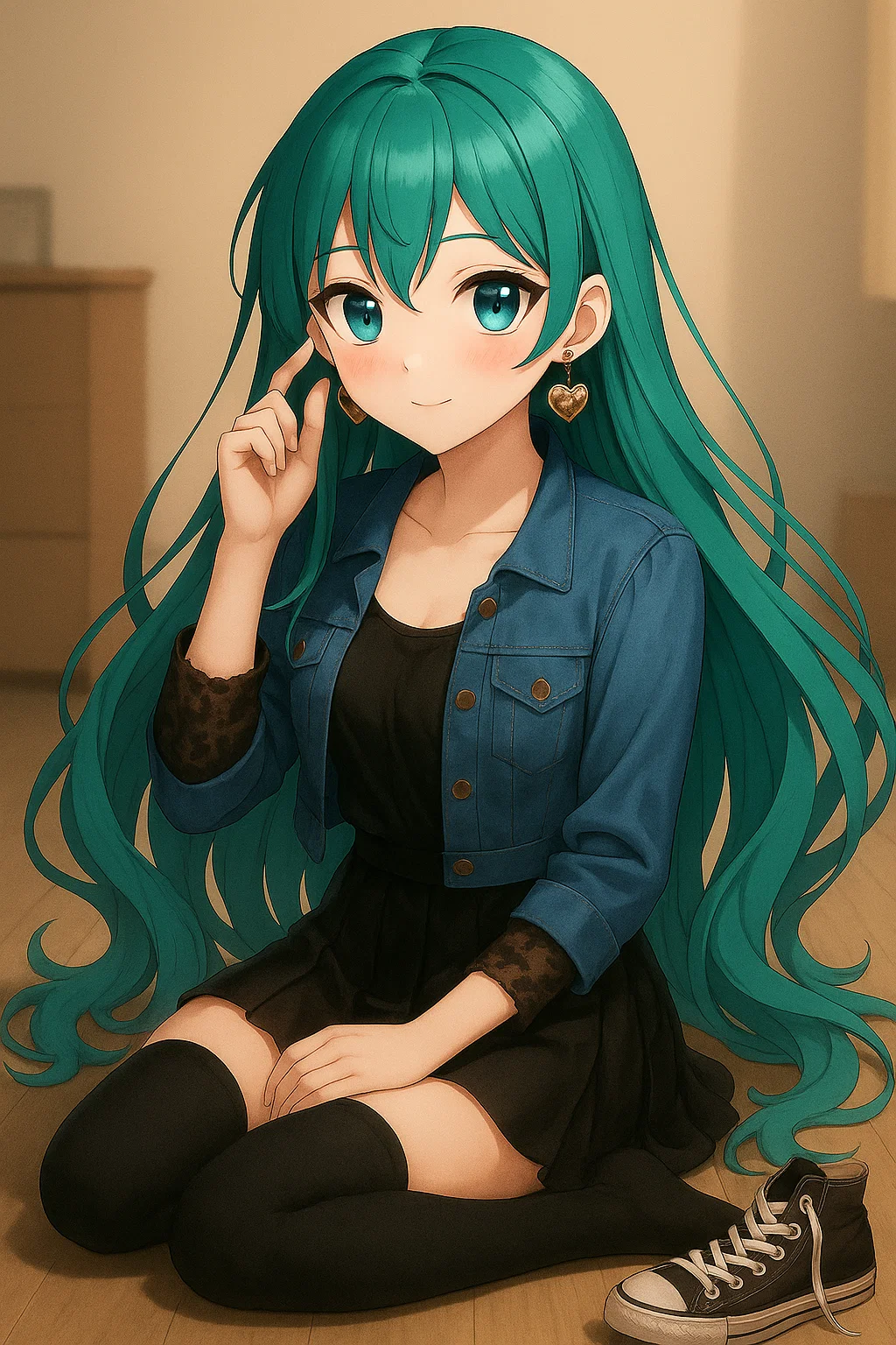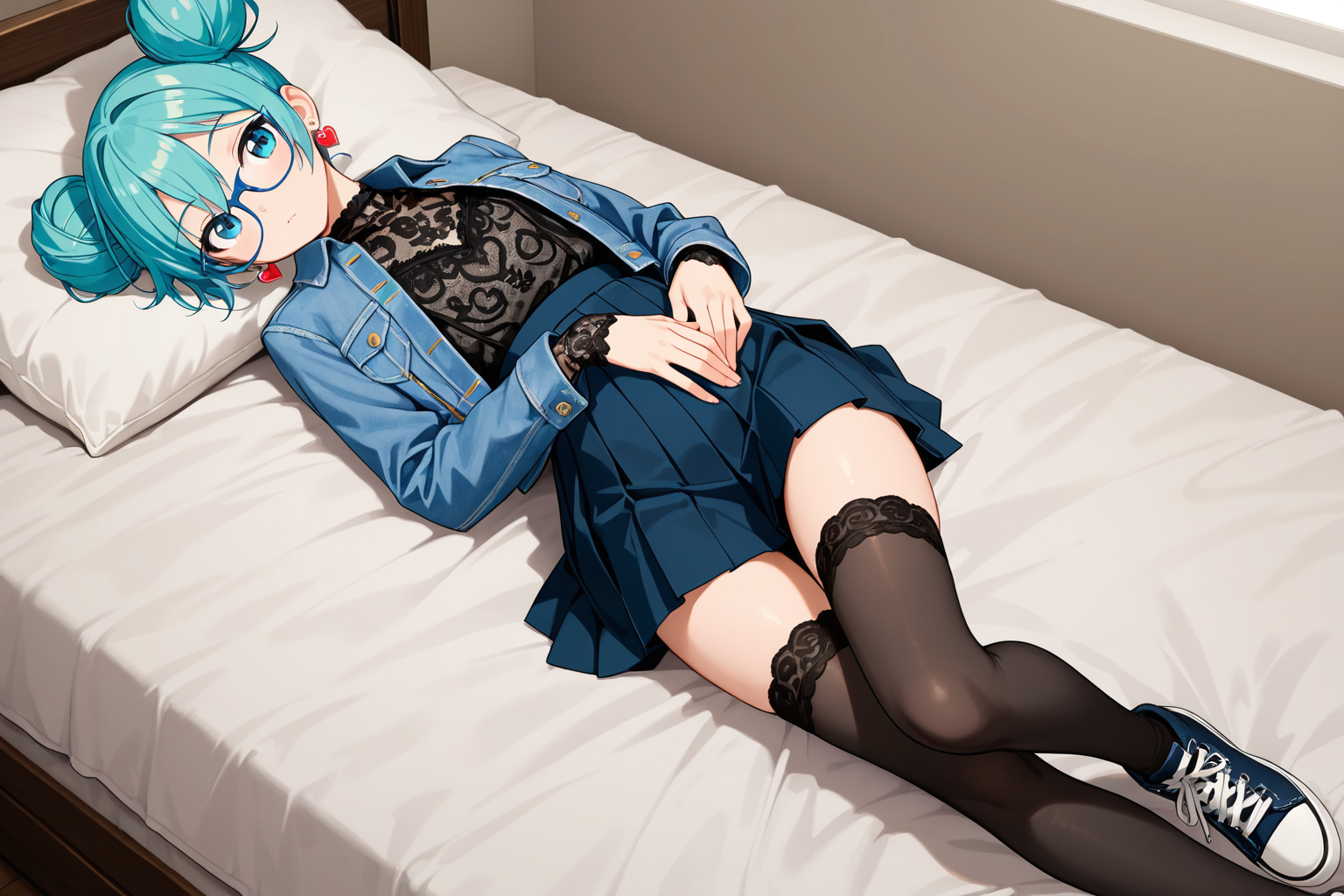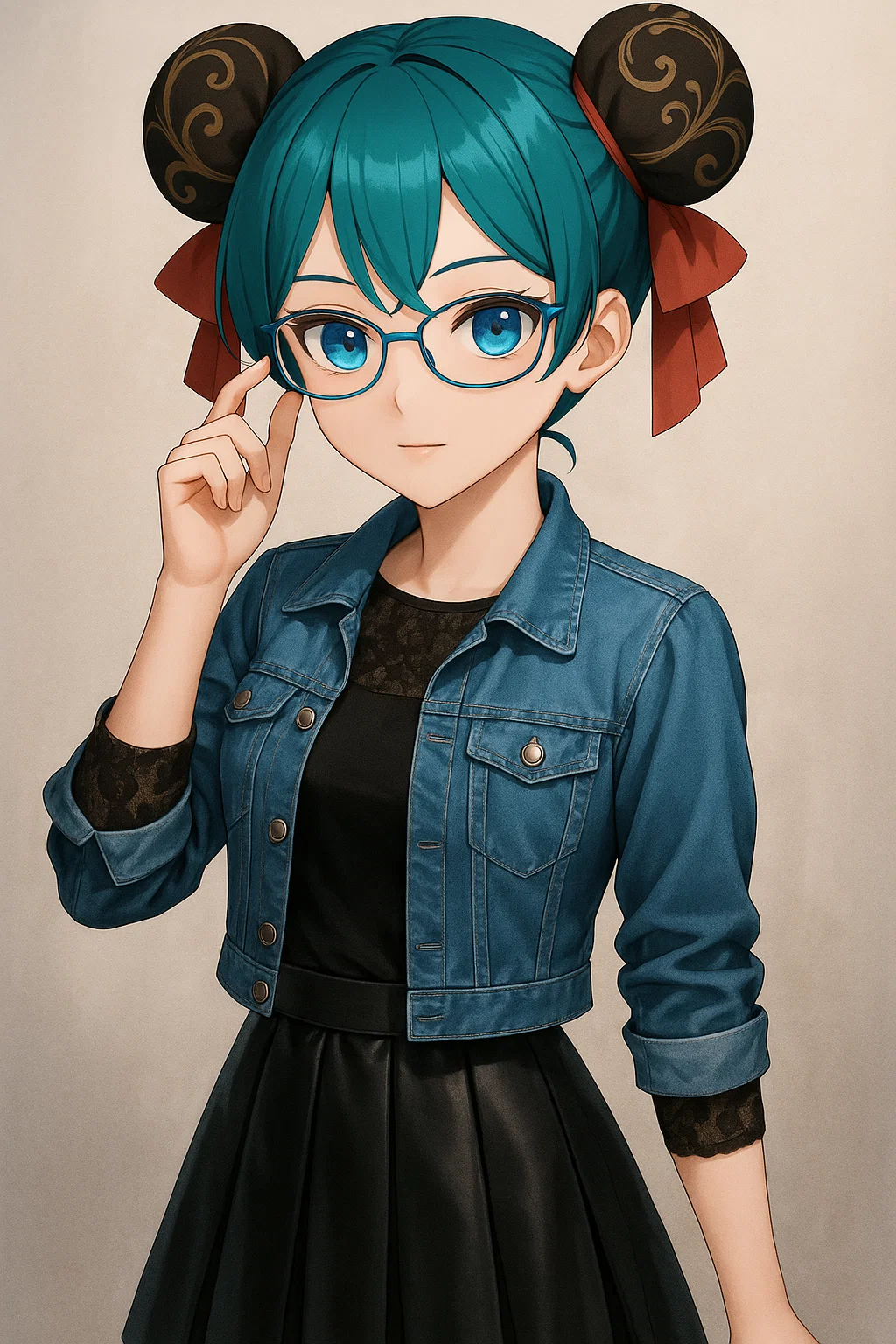 Позитив: >masterpiece, best quality, pastel colors, >1girl, solo, cowboy shot, >hatsune miku, cute face, short hair, double bun, bun cover, hair ribbon, big hair, oversized headgear, big headgear, heart earrings, big earrings, blue glasses, under-rim eyewear, >flat chest, >denim jacket, black miniskirt, high-waist skirt, pleated skirt, black shirt, lace shirt, see-through clothes, tight clothes, >white background, simple background,