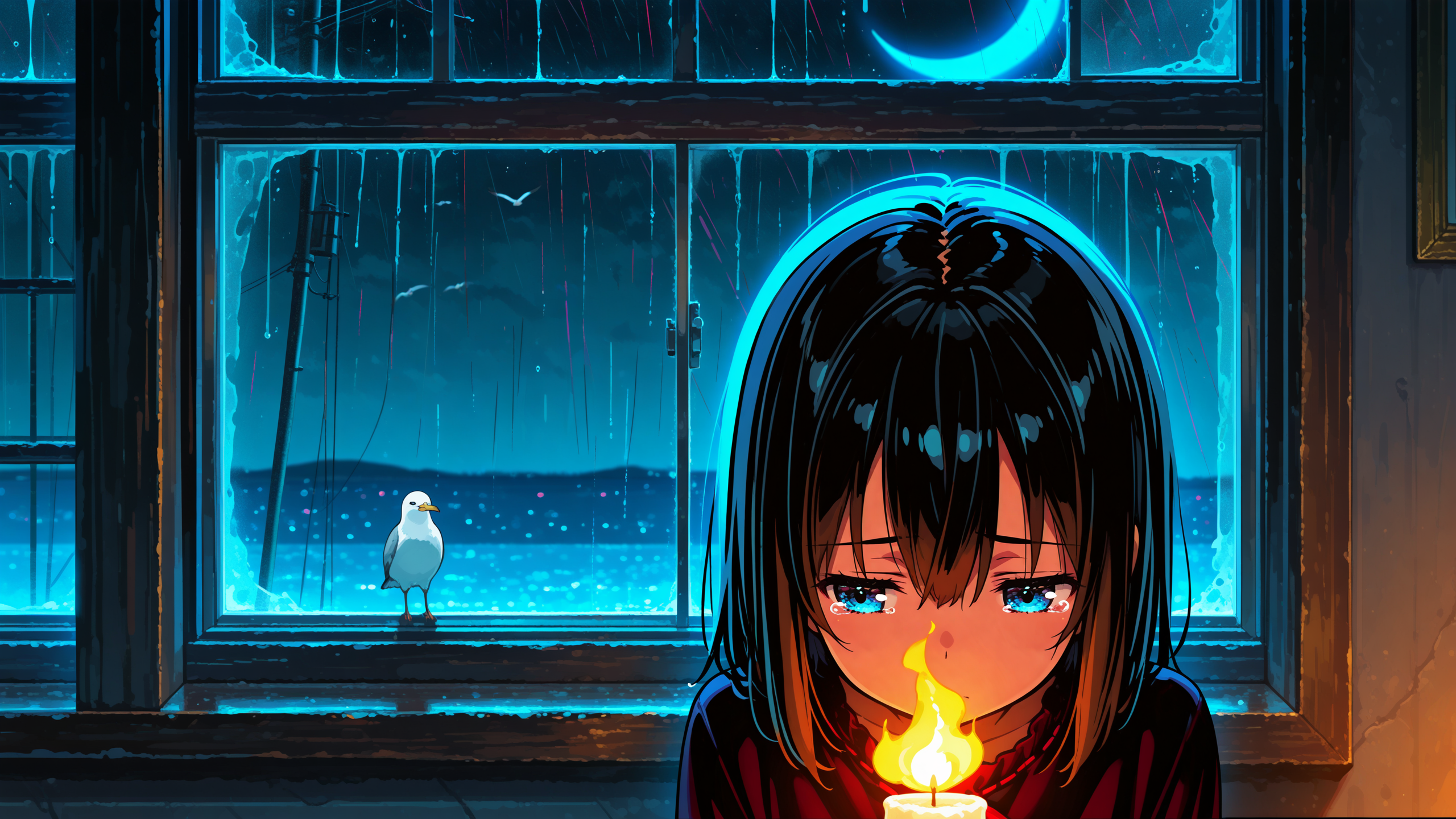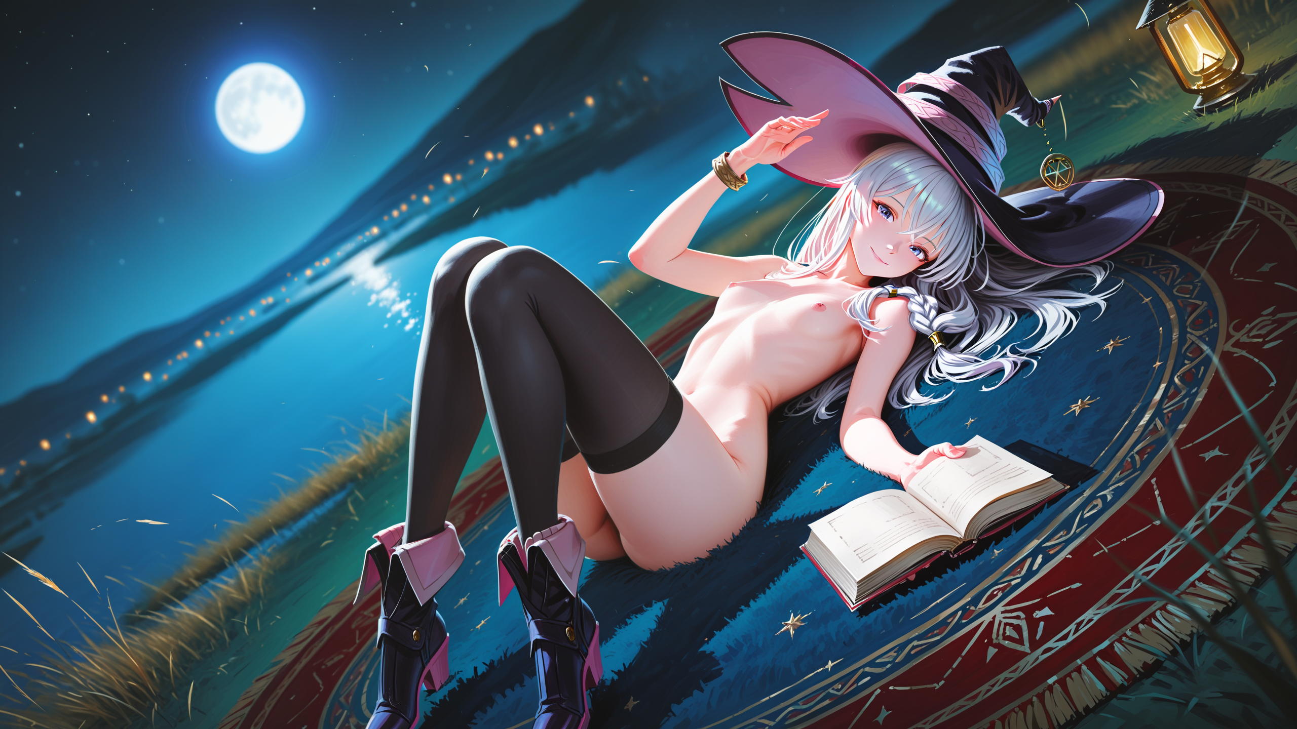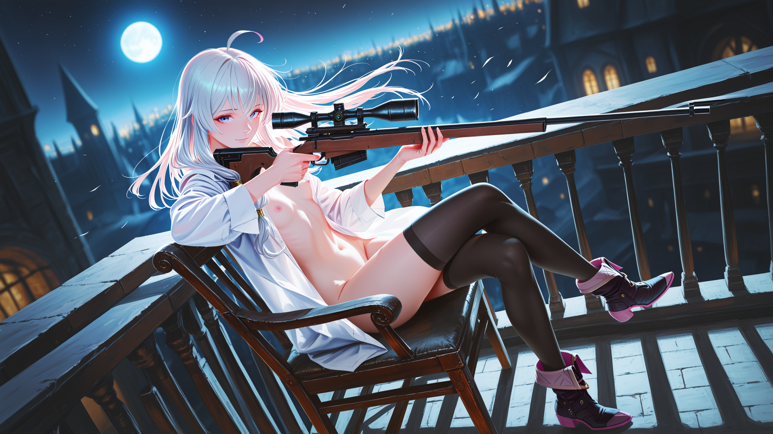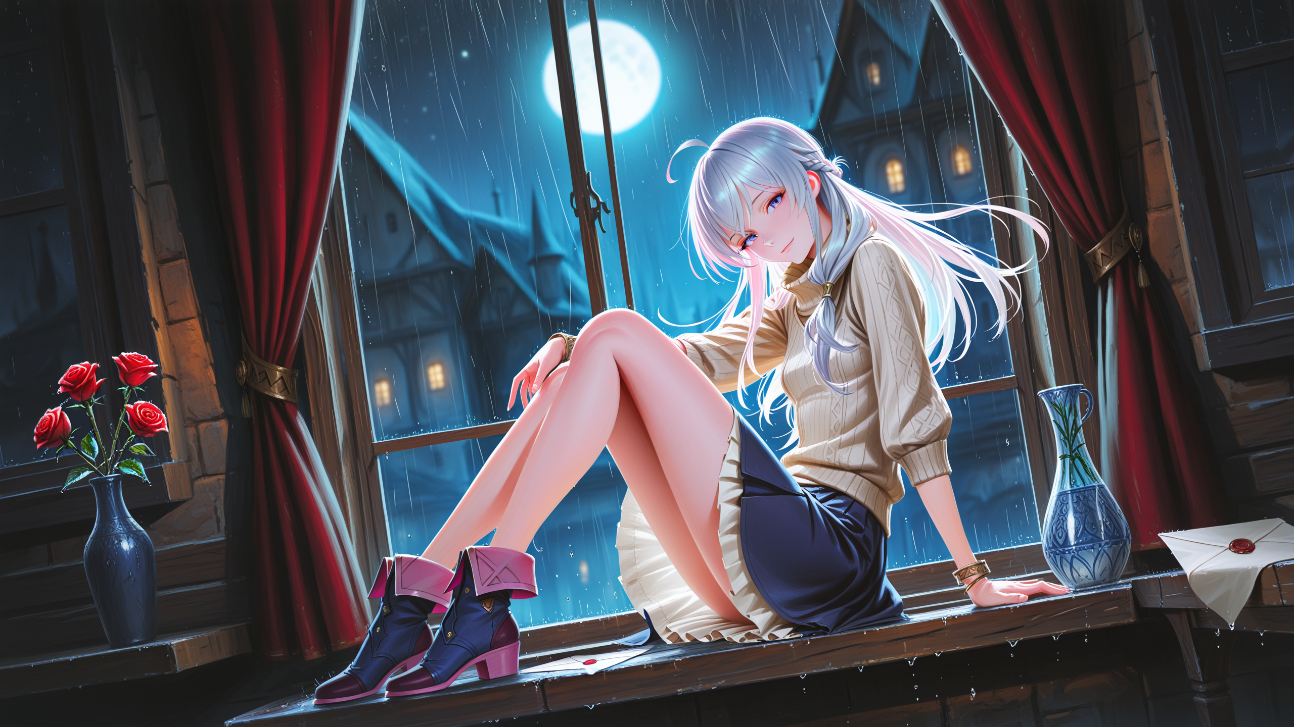 1girl, elaina, ivory hair, long hair, deep blue eyes, ahoge, adult, shadow, blurry background, expression, underlighting, small breasts, 21 yo age, mature female, action pose, light smile, looking at viewer, nababa style, hands, wind, realistic, posing, night, moon, stars, indoors, window, curtains, sitting on windowsill, medieval city, fantasy, dutch angle, full body, blue boots, rain behind window, turtleneck sweater, blue skirt, white underskirt, knees up, head tilt, from side,table, vase, rose, letter, braid, bracelet, hand on own knee, hand on own foot, cum in ass, after anal