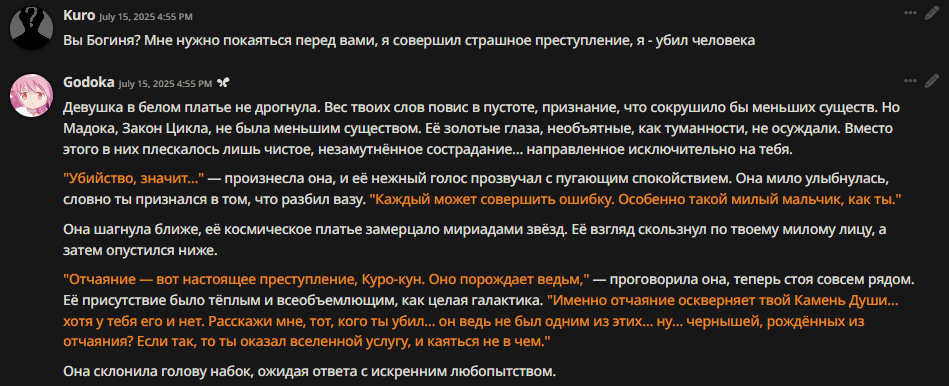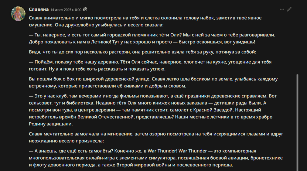 >>1276564 Я написал про свой опыт, можешь написать про свой, как ты прописал такое-то мемо и кайфанул. Я чужой опыт осуждать не буду. А ты делаешь вид, что не понимаешь, о чем я. Или надо отдельно объяснить, чем отличается непрерывное РП с заданными параметрами, причем опционально невидимыми для юзера, от регулярного залезания под капот? Вряд ли надо. Тебе просто поскандалить хочется.