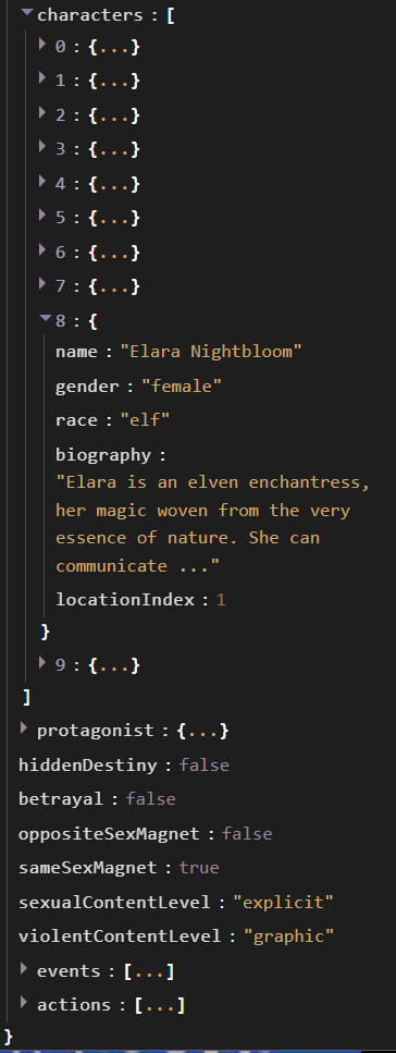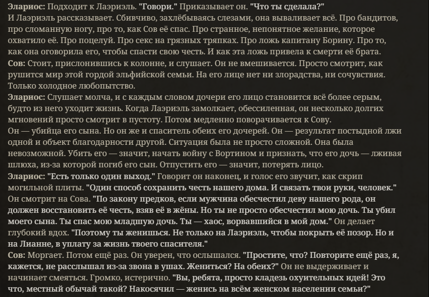 Чёт двач упал... Короче оно багнулось и я перезапустил, теперь работает. Aelyria это второе частое имя после Элары, если не ошибаюсь. Сгенерировало какое-то пати с которым, видимо, я хожу. В начале даёт сеттинг, перса и галочки секс, насилие, какие-то будущие триггеры на предательство, секс магнит и скрытую великую судьбу.