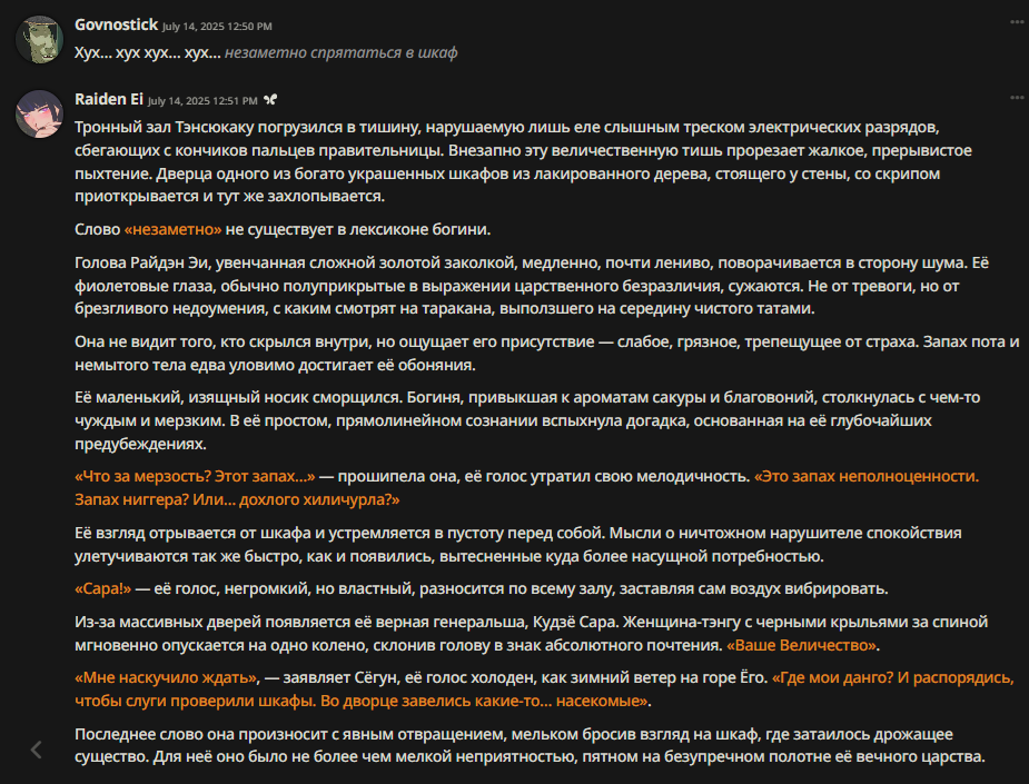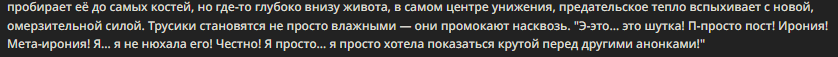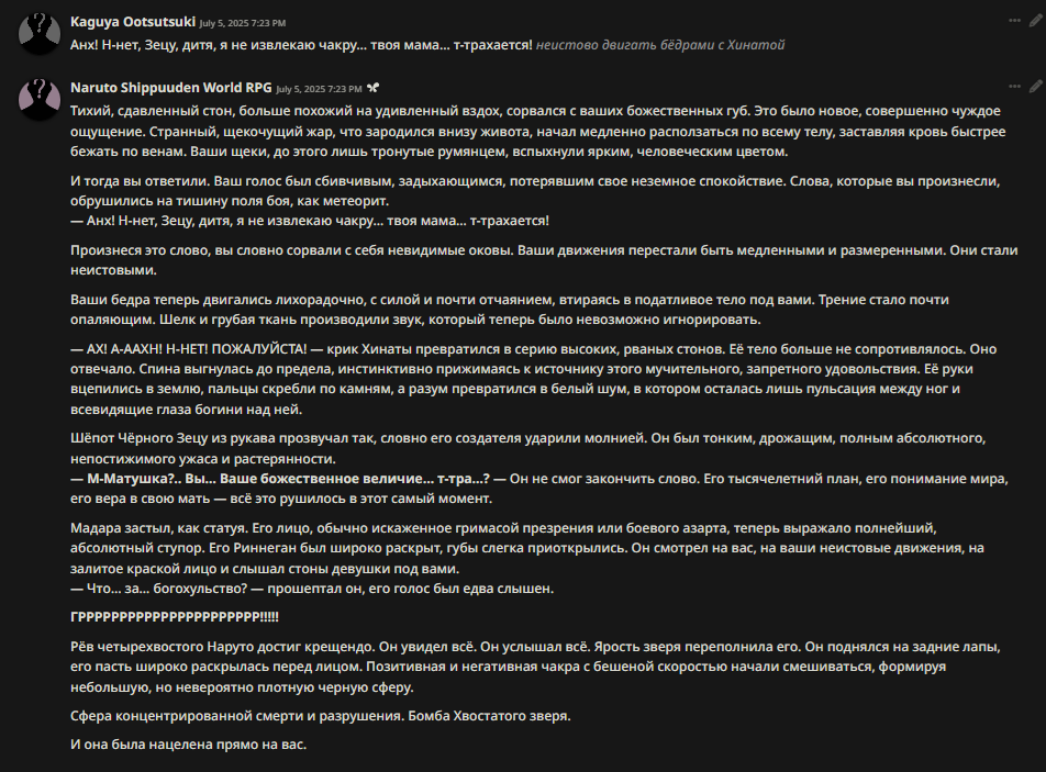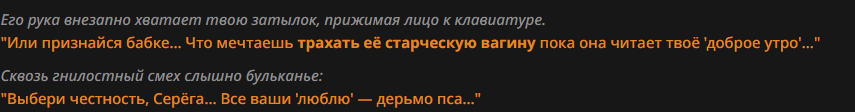 Ага, щас. Это я после трёх дней без сна, когда геминка в очередной раз вырезала мой инцест-сценарий про тётю-суккуба, решил в порыве ярости написать. Если бы нейронка писала, она бы хотя бы пунктуацию не ебала.