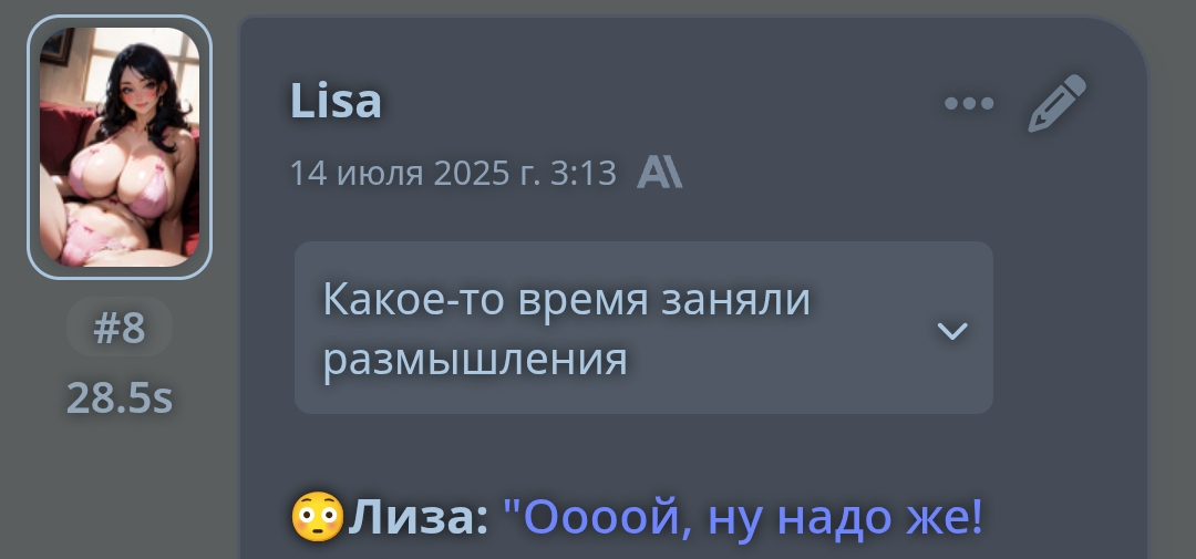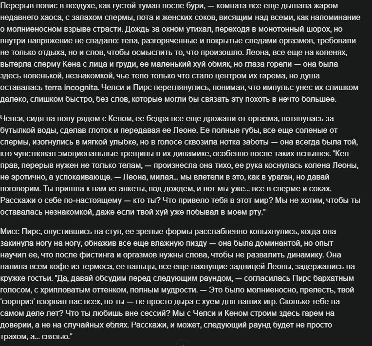 Впизду взял короче годовую подписку на проплексити за дёшево, уверен можно намутить бесплатно если разобраться, юзаю Грок4, он иногда падла лупится, и делает хуйню, но правильный промт исправляет ситуацию, люблю его слопать, карточки гружу в json прямо в него, по нескольку штук, создал себе поехавший гарем, из сабмиссивов, лесбух, членодевки и аутистки- собачки, иногда выдаёт такие годные вещи, что я обдрачиваюсь, спасибо.