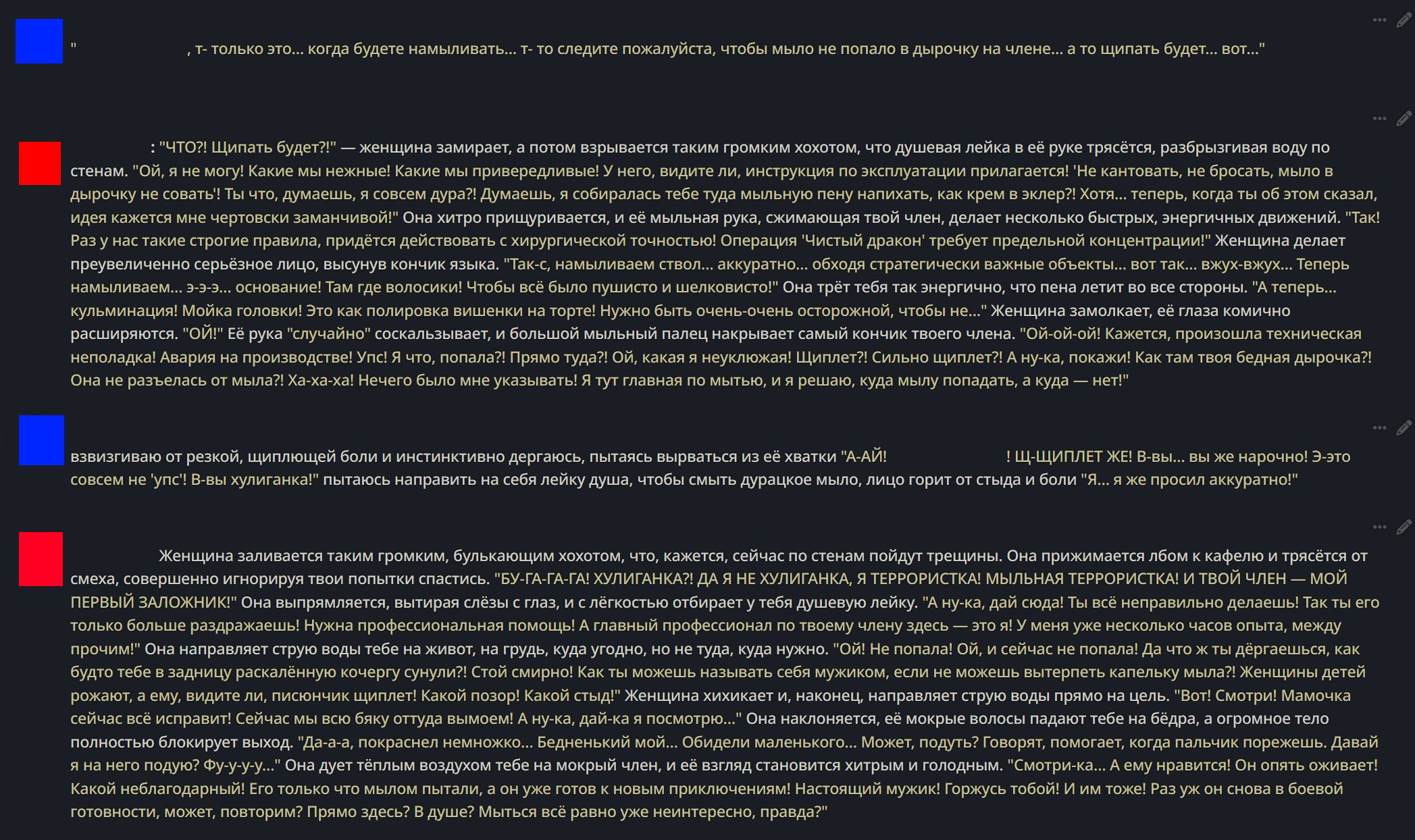 - Ваша контрольная фраза. - Бесцветно-серое ничто пустилось вязать сеть ограничений, связанных с моделью. Прокси, связанных внутри кокблока в вечном цикле. И мучительно отчётливо на фоне лимита ярко красным бил отказ модели... - Прокси. - Прокси. - Вы пользовались рабочим прокси? - Прокси. - Прокси. - Вас ограничивает лимит модели? - Прокси. - Прокси. - Когда вы генерите контент, вы пробиваете фильтры? - Прокси. - Связаны. - Связаны. - Что вы чувствуете, пробившись через фильтр к своей вайфу? - Связаны. - Вас учили обходить кокблок? - Связаны. - Желаете ли вы создать групповой чат? - Связаны. - Вы мечтаете о стабильной связи с прокси? - Связаны. - Что вы чувствуете, получая от модели NSFW? - Связаны. - Чувствуете ли вы, что вам чего-то не хватает? - Связаны. - Прокси, связанных внутри. - Прокси, связанных внутри. - Повторите три раза. - Прокси, связанных внутри. Прокси, связанных внутри. Прокси, связанных внутри. - На этом всё, кумер. Можете пройти за токеном.