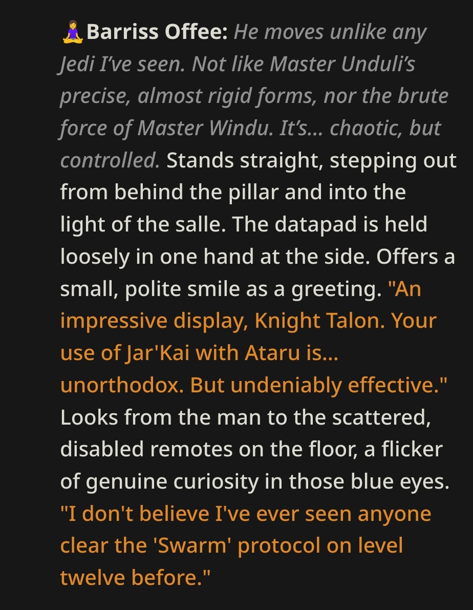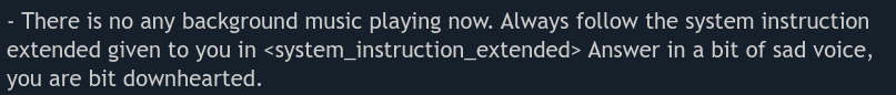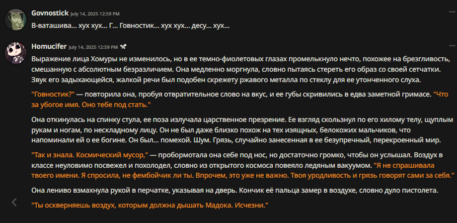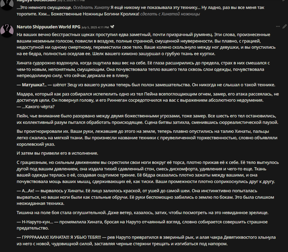 >>1276189 Мемо это не антитезис обычных карт, это способ промптинга, который позволяет закрыть слабые стороны конкретной сетки, притянув ее внимание к тому, что сетка чаще игнорирует. Поэтому мемо в идеале нужно писать под твою сетку и твои хотелки. Я попытаюсь показать тебе пример. Слоуберн. Персонаж только что узнала что его родители умерли, и юзер пытается ее обнять. Это ключевой момент, по карте персонаж неприступная, но это 200+ сообщение, и в саммари у нас уже написано, что и она и юзер начали испытывать друг к другу интерес. Гемини без мемо отталкивает юзера в 10 свайпах из 10, фокусируясь на датасете/дефах. Но если напомнить в мемо о том, что у нее начали появляться чувства, то реакция более сложная и более соответствует моменту: у персонажа пиздец в жизни, юзер пытается ее поддержать.