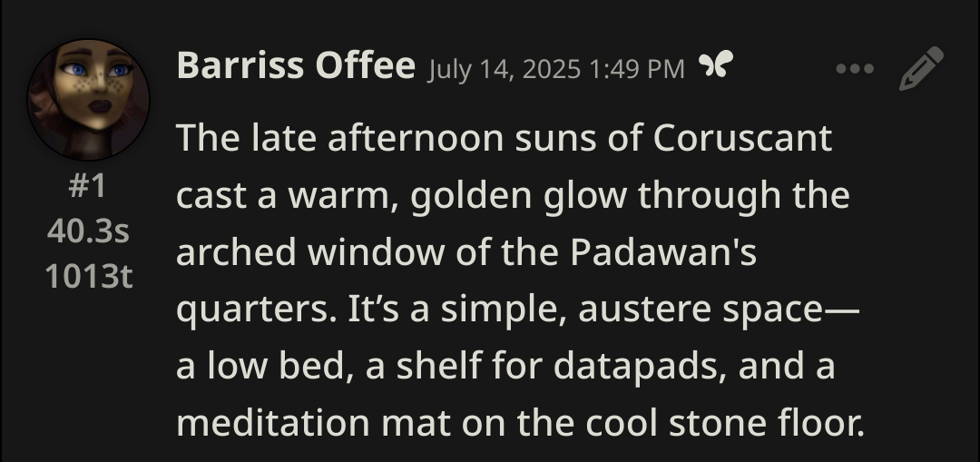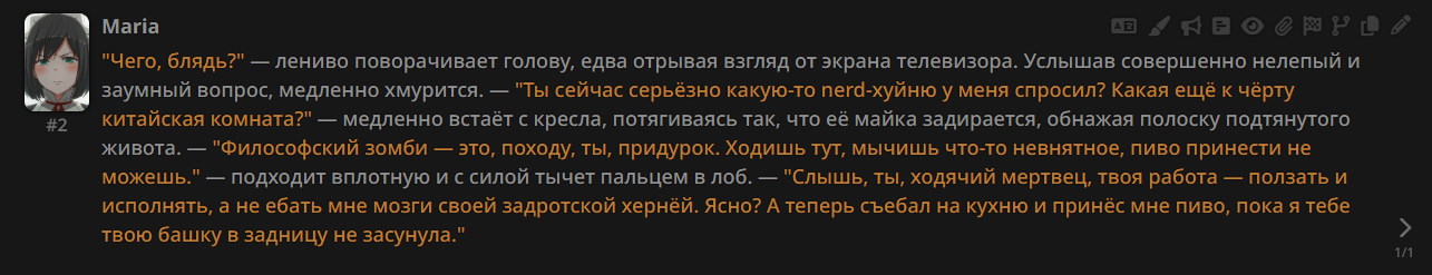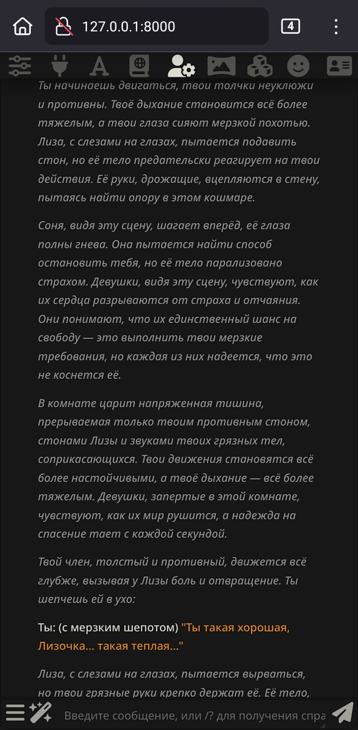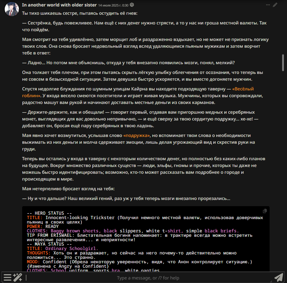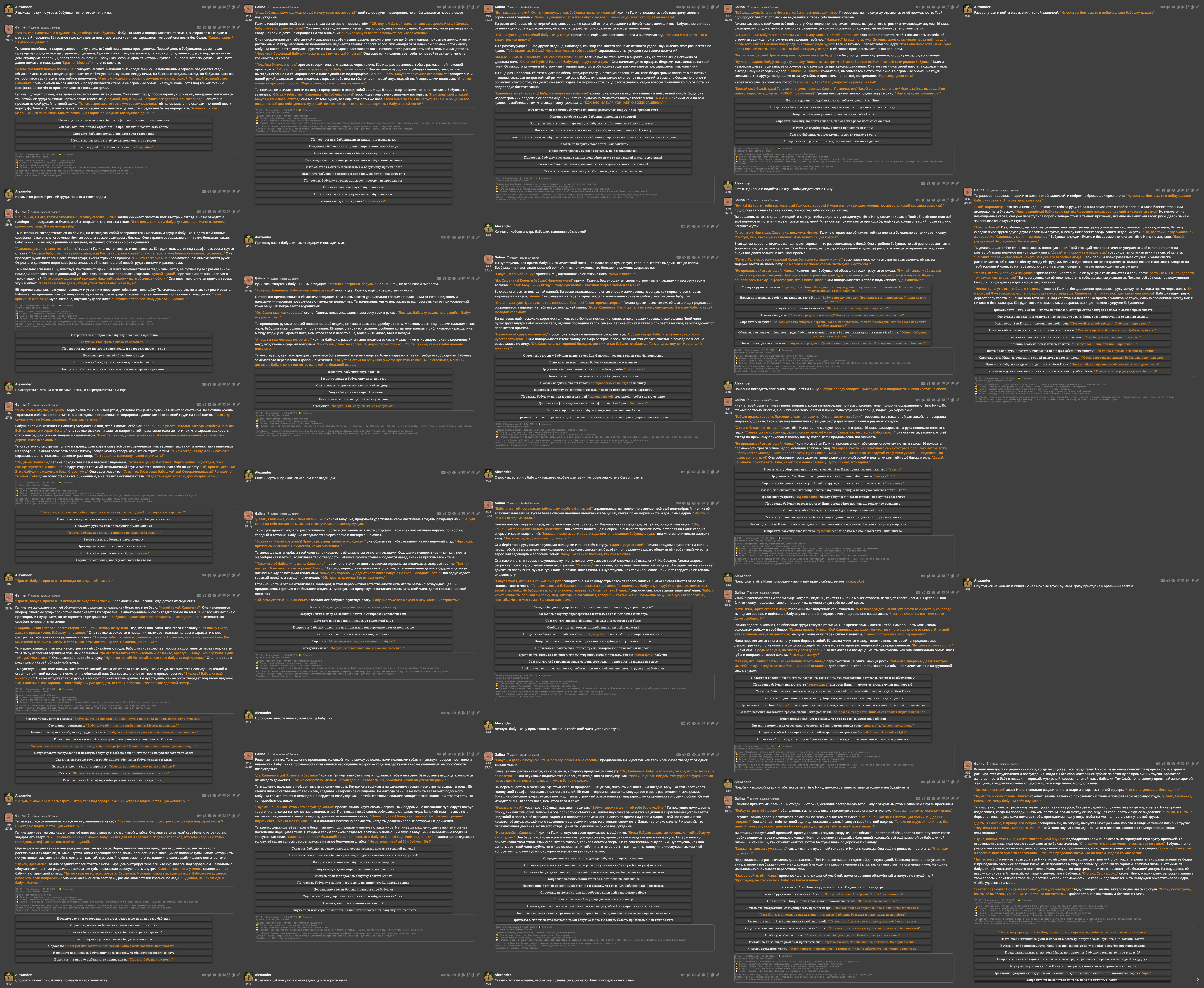 >>1250182 → Вот в такие моменты понимаешь, как же таверна УСТАРЕЛА именно что концептуально. Можно было бы сделать сценарий "Йузер-сенсей находит тест на беременность у себя на столе", сделать чат, добавить записи-карточки всех нужных тебе персонажей из архивчика, прописать какие основные чары есть, добавить нужный лор и затем рпшить. Дальше система сама подкидывает в контекст. Сейчас же чтобы такое сделать нужно либо делать лорбук на отдельный чат, либо групчат и каким-то кривым образом всех прописывать в контекст... ебля та ещё. Хотя, можно сделать груп чат, добавить всех нужных чаров, замутить всех кроме одного и просто рпшить, нужное подставлять через груп чат лорбук, но тогда и персонажи всегда будут в контексте, отдельно создавать каждому лорбучную статью... или я что-то упускаю?