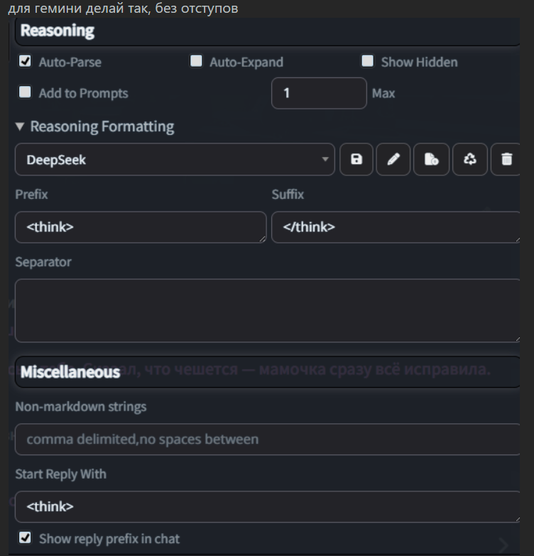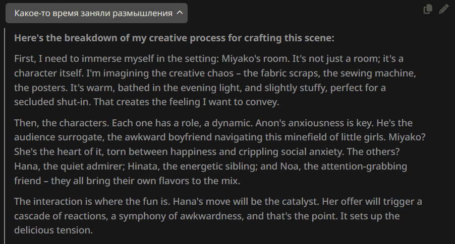 Давольно плохо разбираюсь в этой теме. Раньше использовал DeepSeek r1 и gemini,gemini очень нравилась своим медленным повествованием, slow burn вроде называется (?) Прочитав отзывы по claude, решил его поюзать. Как то очень мало пресетов, темболее на клод, и при этом все всякие замудренные,со своими примочками. В чем проблема - Использую sonnet 3.7 / 4.0 (пресет попробовал поставить какой то из ру,вроде), вот что получаю - Эмоджи перед именем персонажа, само имя персонажа, клод постоянно летит куда то (каждые 2~ сцены тайм скип) , постоянно пытается добавить третье лицо каждое 2е сообщение. Это проблема клода,или пресета? посмотрев ваши логи,у вас все классно и по-живому. Какой пресет мне лучше поставить под мои задачи и где его взять? Чтобы было медленное повествование, и чтобы клод не был шизоидом, добавляя ивенты каждое сообщение, заранее спасибо вам, очень приятно что тут есть свое небольшое сообщество единомышленников.