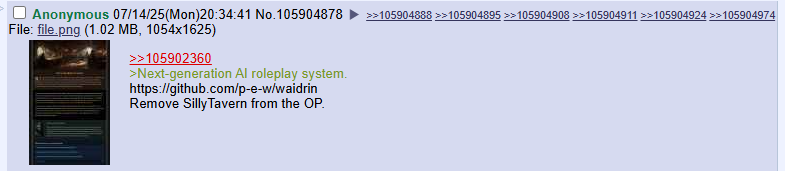 >Waidrin doesn't use RAG. It doesn't use keyword-based heuristics. It has a structured understanding of the story, and can programmatically assemble a prompt containing exactly the information needed to drive the plot forward. >pretty cutting-edge components: A state schema described using Zod, turned into statically-checked TypeScript types that are also validated at runtime, dynamically compiled into JSON schemas to guide object generation in the LLM, stored in a Zustand global state store, managed by Immer to provide atomic state transformations. It provides subscriptions for state changes, and corresponding React hooks (though React is not required to use it).